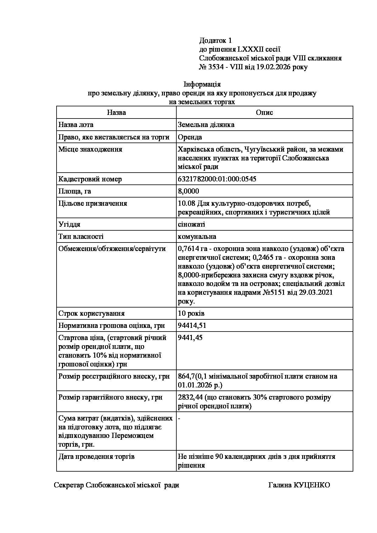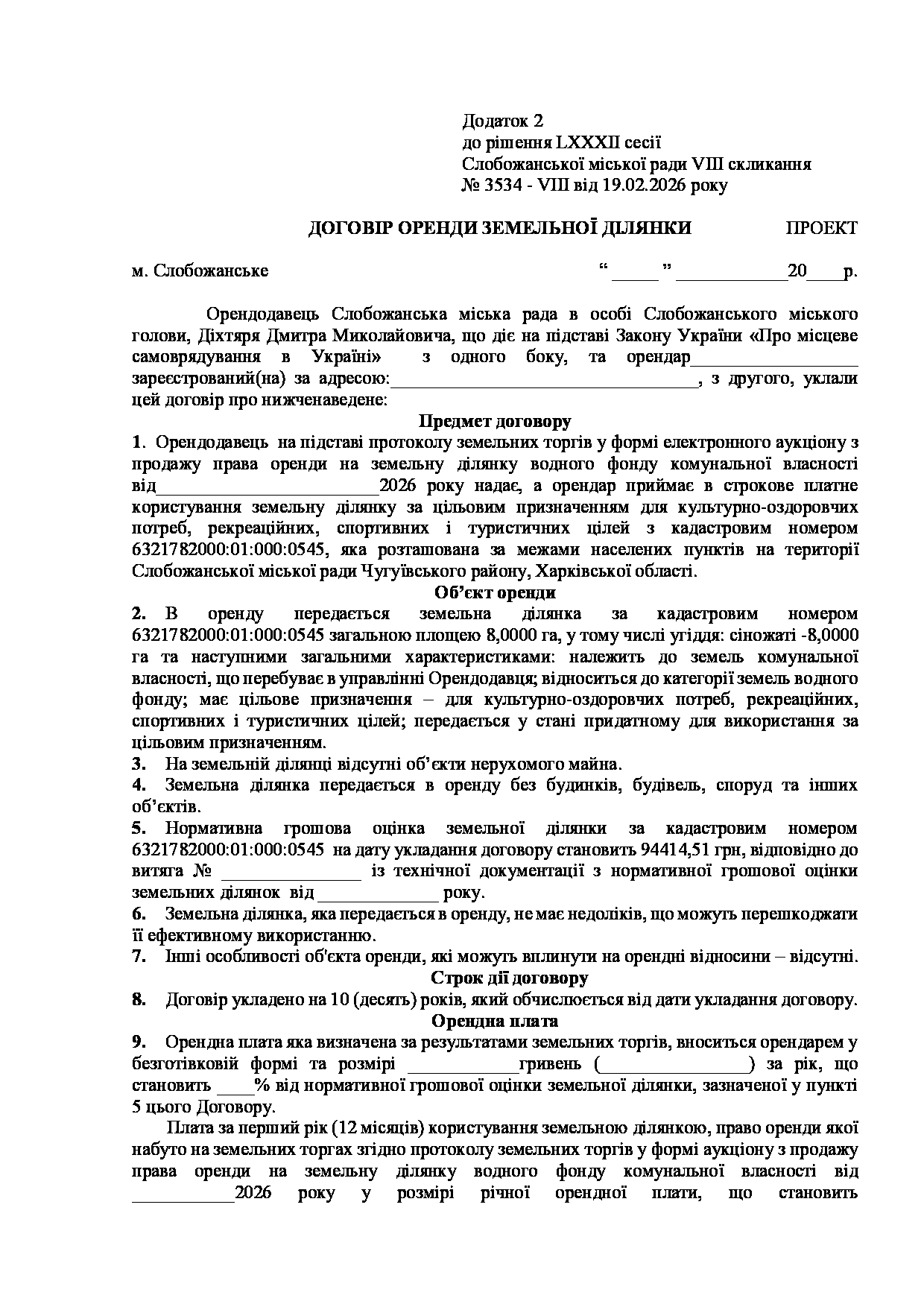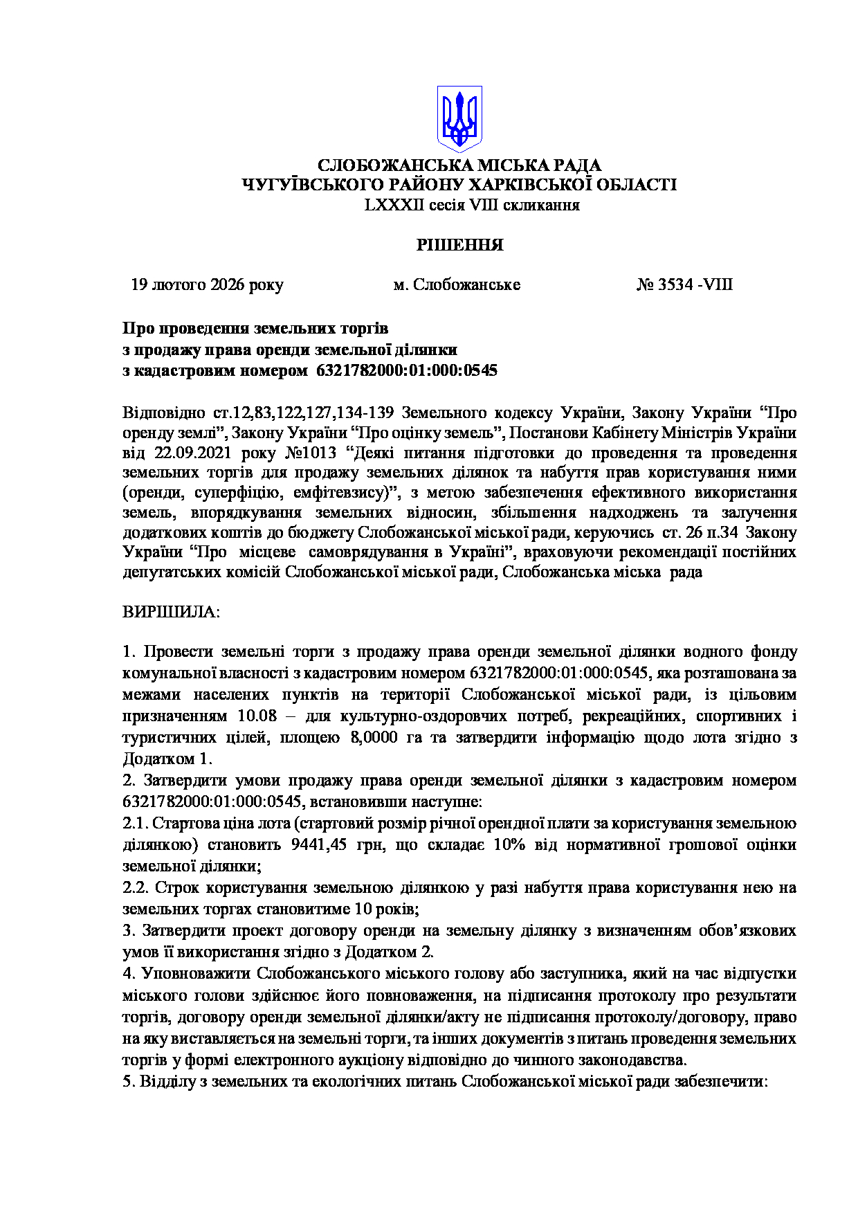 Текст рішення сесії №3534 Про проведення земельних торгів з продажу права оренди земельної ділянки з кадастровим номером 6321782000:01:000:0545.