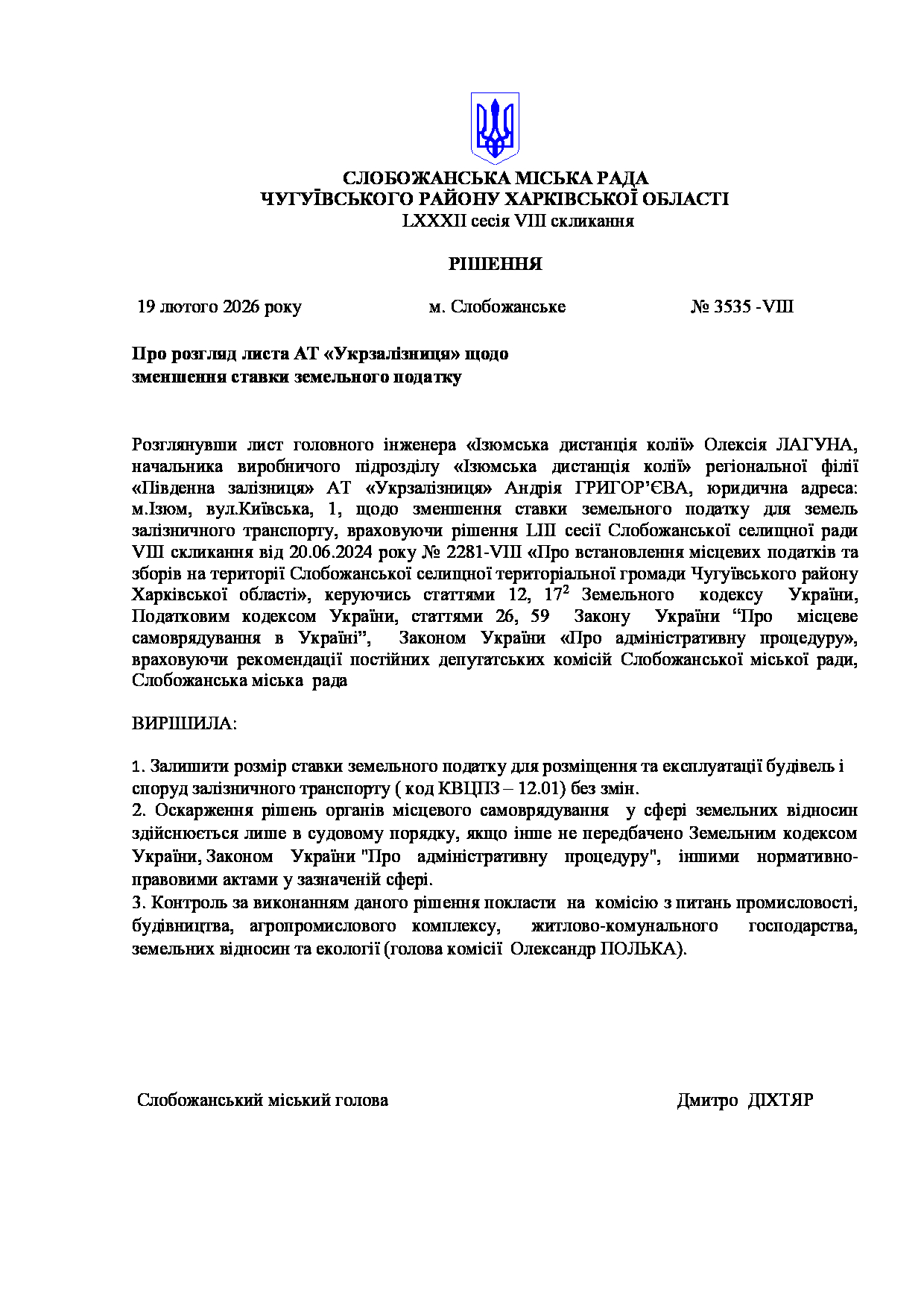 Текст рішення сесії №3535 Про розгляд листа АТ «Укрзалізниця» щодо зменшення ставки земельного податку.