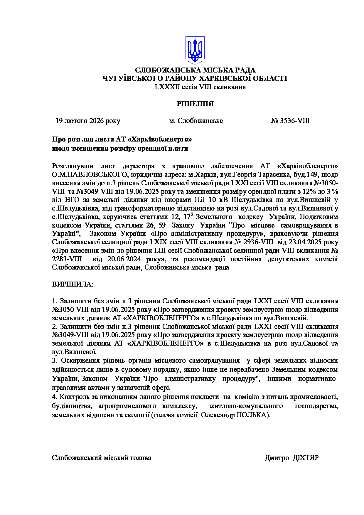 Текст рішення сесії №3536 Про розгляд листа АТ «Харківобленерго» щодо зменшення розміру орендної плати.