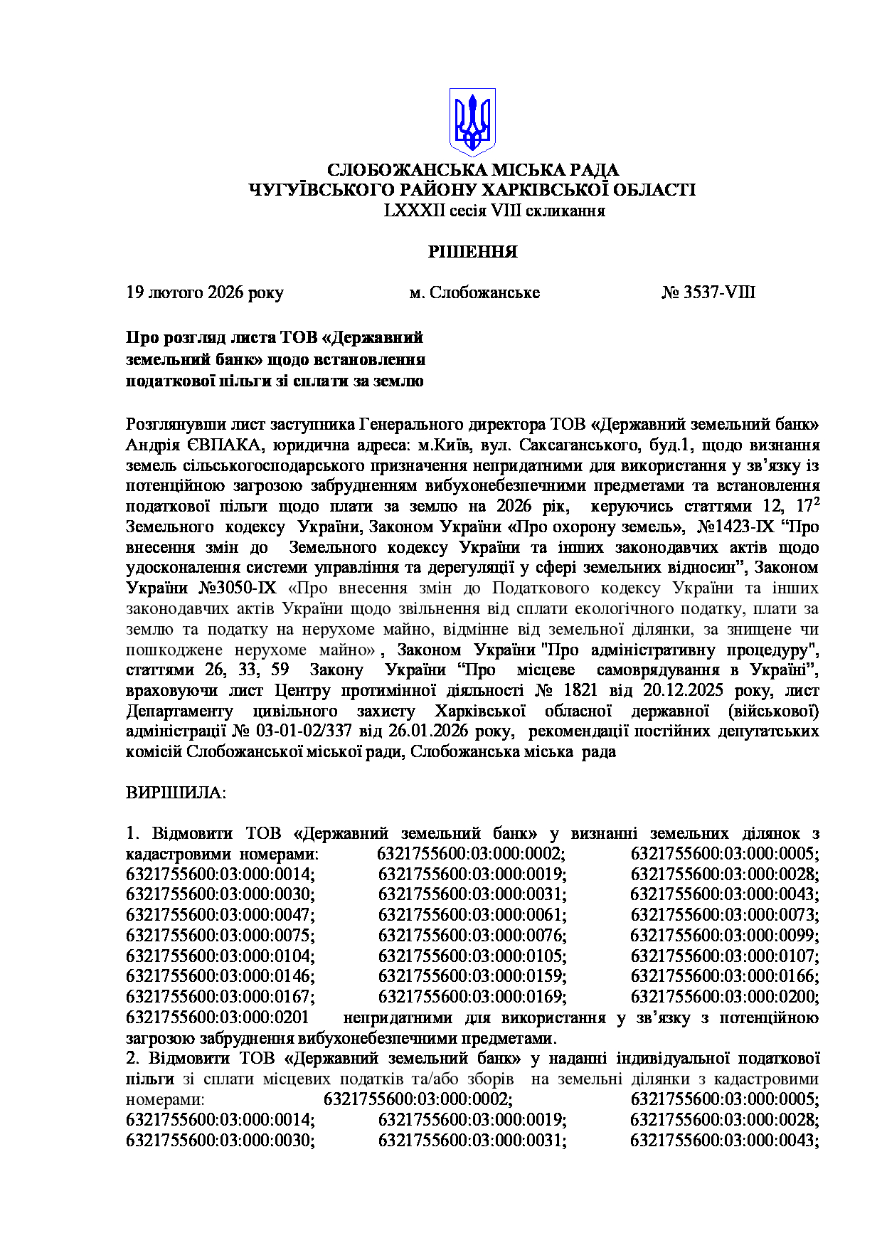 Текст рішення сесії №3537 Про розгляд листа ТОВ «Державний земельний банк» щодо встановлення податкової пільги зі сплати за землю.