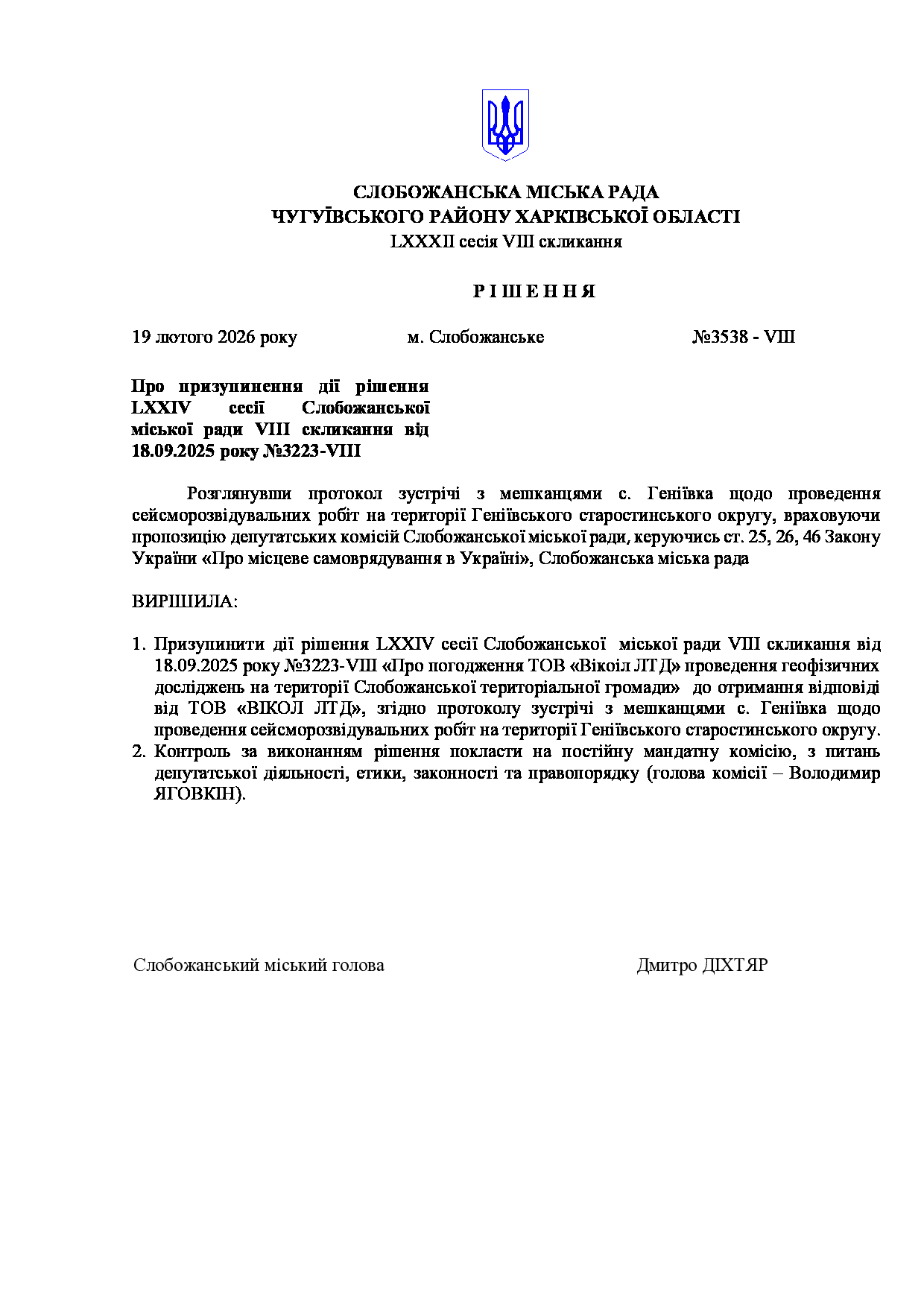 Текст рішення сесії №3538 Про призупинення дії рішення LXXIV сесії Слобожанської міської ради VIII скликання від 18.09.2025 року №3223-VIII.