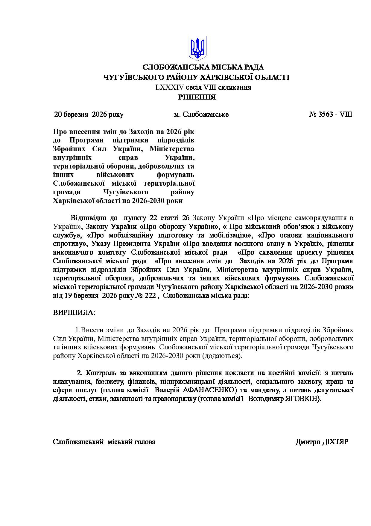 Текст рішення сесії №3563 Про внесення змін до Заходів на 2026 рік до Програми підтримки підрозділів Збройних Сил України, Міністерства внутрішніх справ України, територіальної оборони, добровольчих та інших військових формувань Слобожанської міської територіальної громади Чугуївського району Харківської області на 2026-2030 роки
