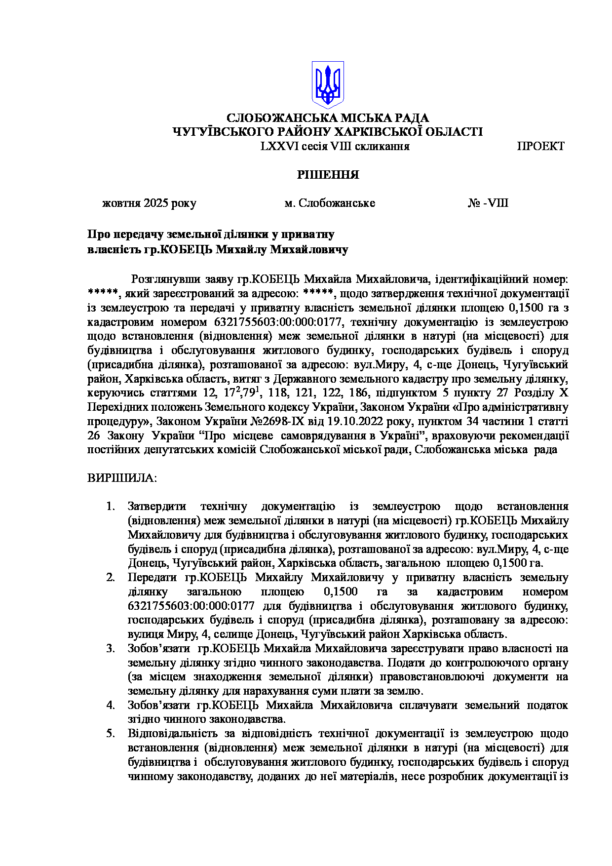 Текст проекту рішення сесії №003 Про передачу земельної ділянки у приватну власність гр.КОБЕЦЬ Михайлу Михайловичу.