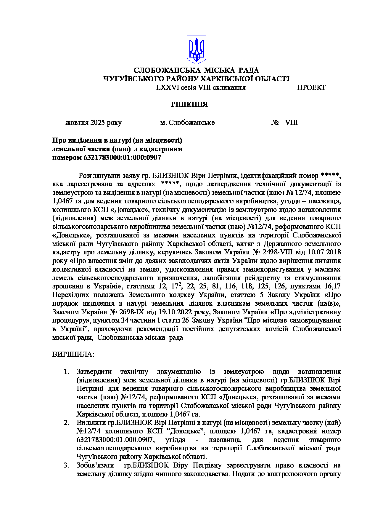 Текст проекту рішення сесії №004 Про виділення в натурі (на місцевості) земельної частки (паю) з кадастровим номером 6321783000:01:000:0907.