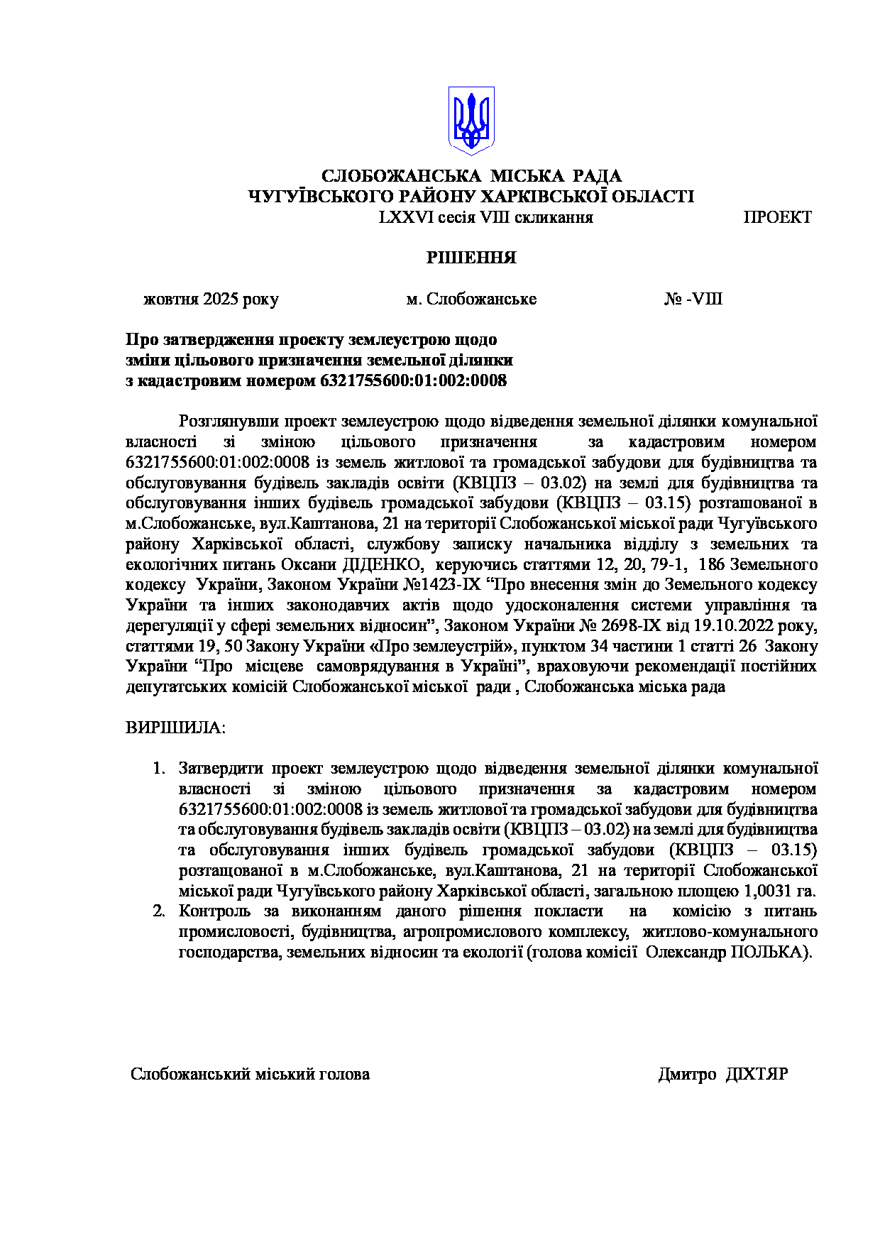 Текст проекту рішення сесії №006 Про затвердження проекту землеустрою щодо зміни цільового призначення земельної ділянки з кадастровим номером 6321755600:01:002:0008.