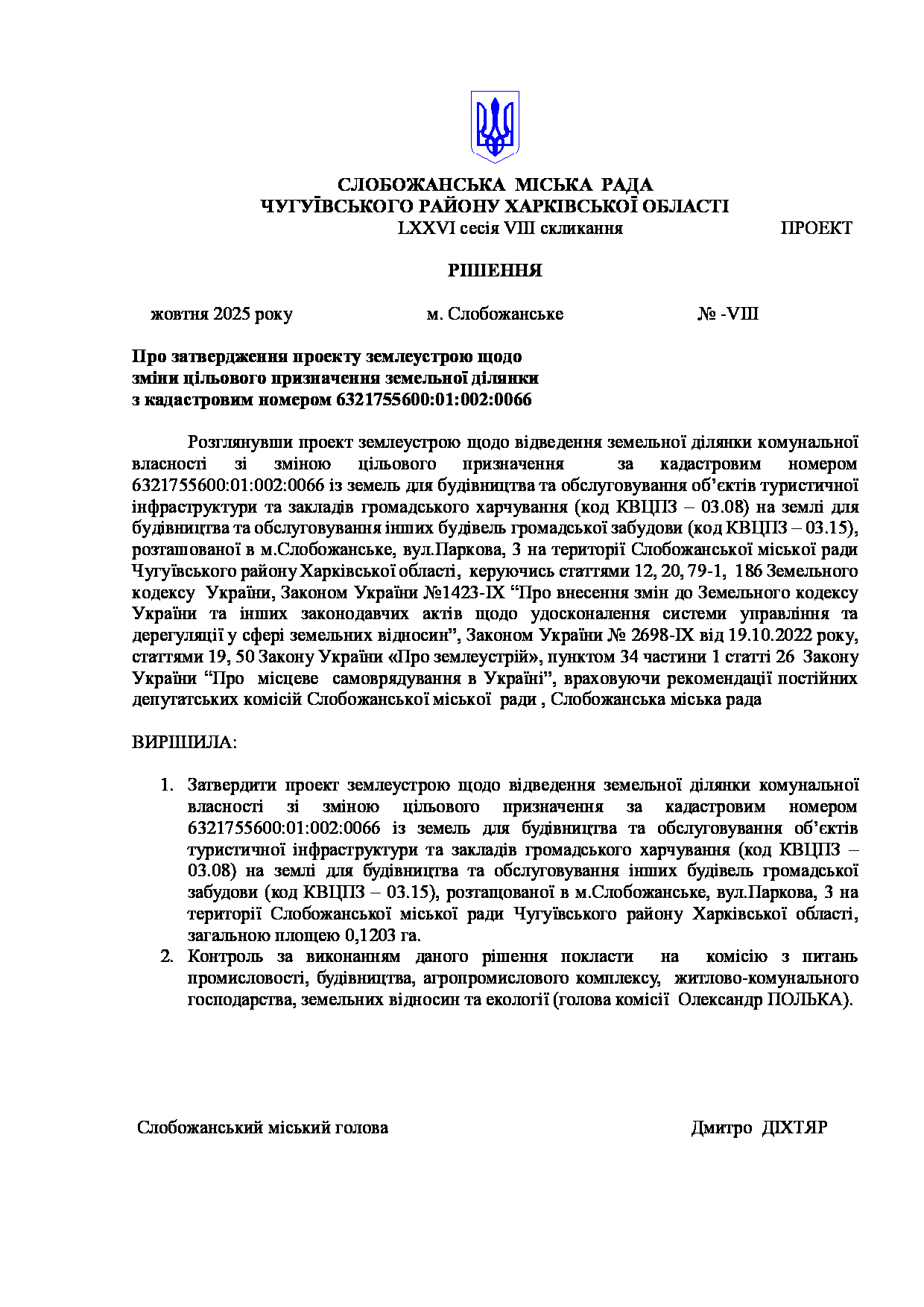 Текст проекту рішення сесії №007 Про затвердження проекту землеустрою щодо зміни цільового призначення земельної ділянки з кадастровим номером 6321755600:01:002:0066.
