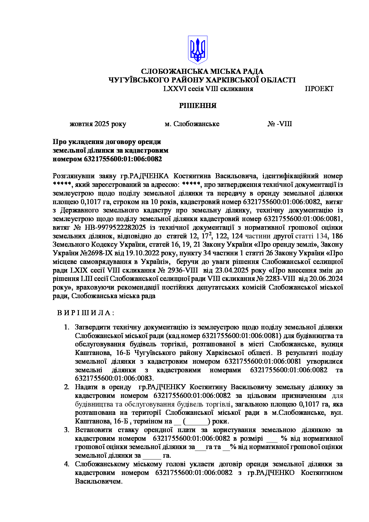 Текст проекту рішення сесії №008 Про укладення договору оренди земельної ділянки за кадастровим номером 6321755600:01:006:0082.