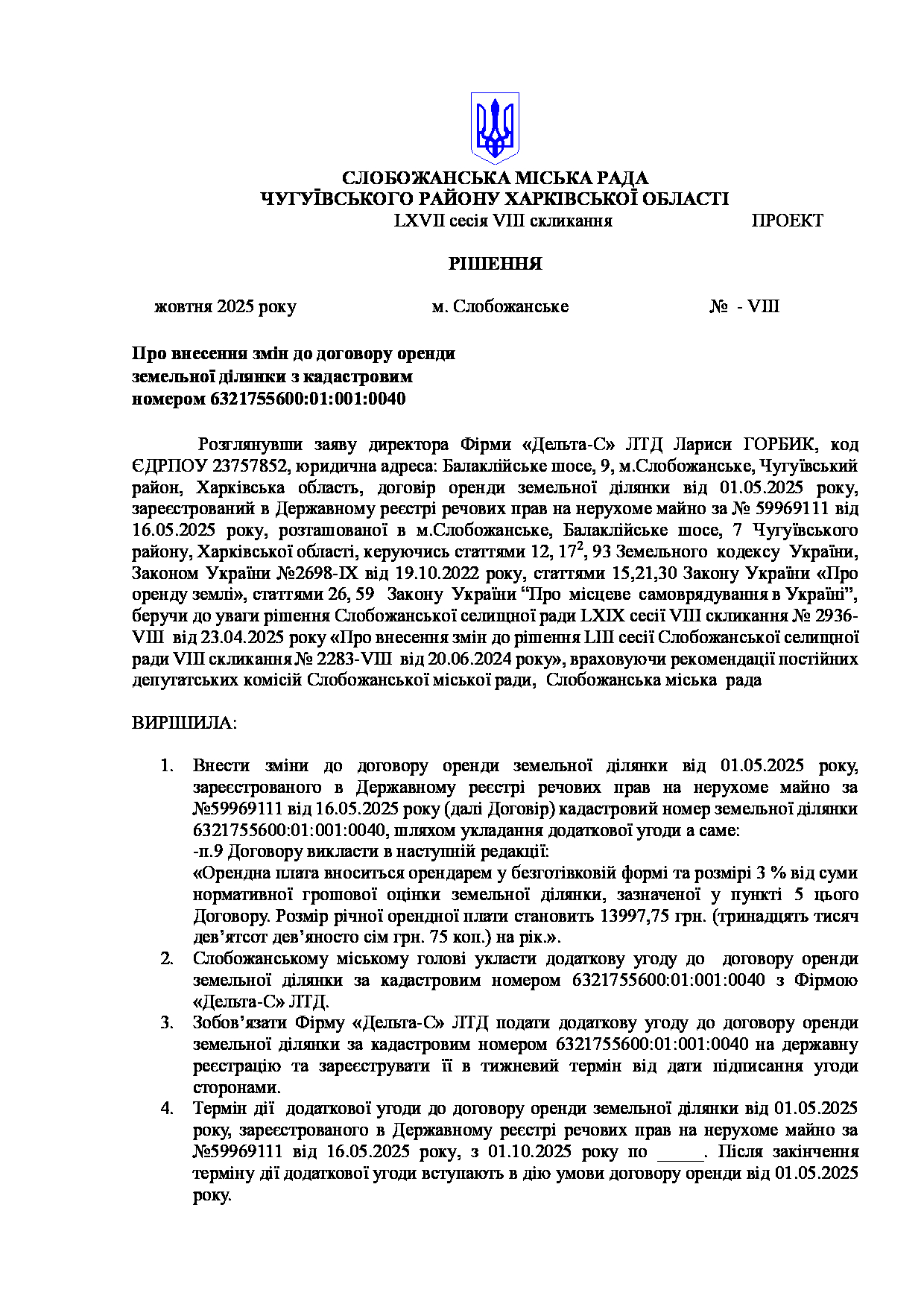 Текст проекту рішення сесії №009 Про внесення змін до договору оренди земельної ділянки з кадастровим номером 6321755600:01:001:0040.