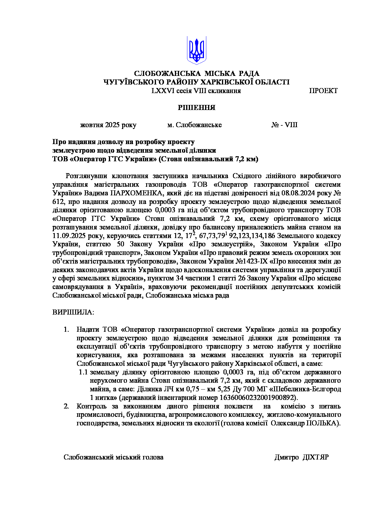 Текст проекту рішення сесії №012 Про надання дозволу на розробку проекту землеустрою щодо відведення земельної ділянки ТОВ «Оператор ГТС України» (Стовп опізнавальний 7,2 км).