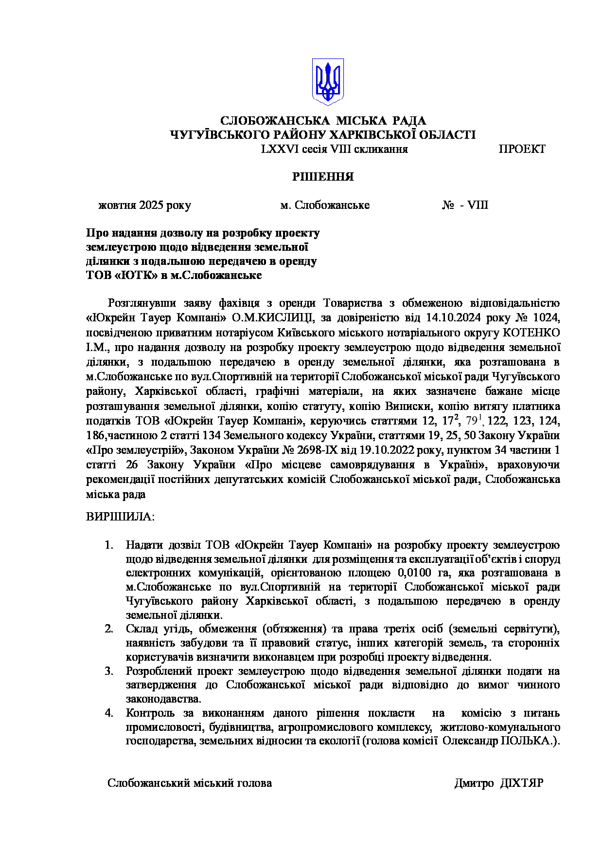 Текст проекту рішення сесії №017 Про надання дозволу на розробку проекту землеустрою щодо відведення земельної ділянки з подальшою передачею в оренду ТОВ «ЮТК» в м.Слобожанське.