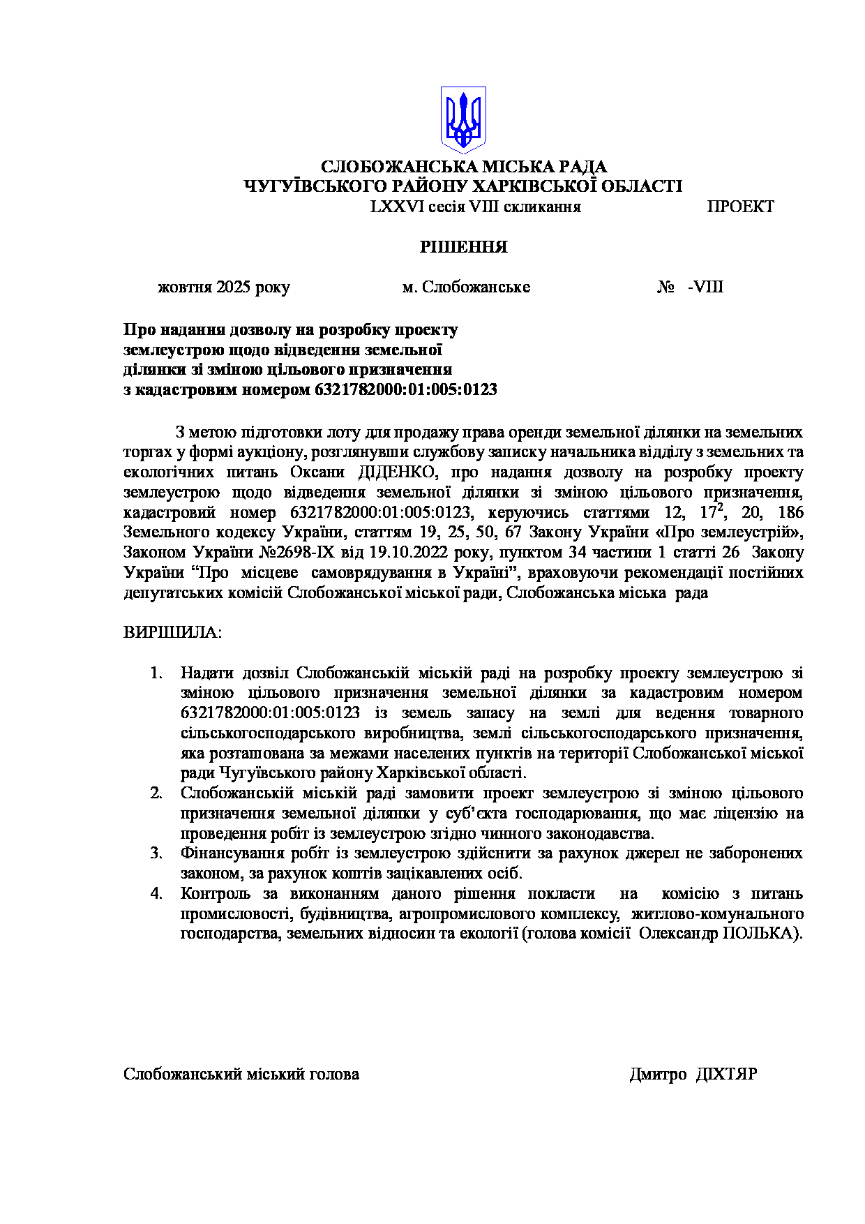 Текст проекту рішення сесії №019 Про надання дозволу на розробку проекту землеустрою щодо відведення земельної ділянки зі зміною цільового призначення з кадастровим номером 6321782000:01:005:0123.