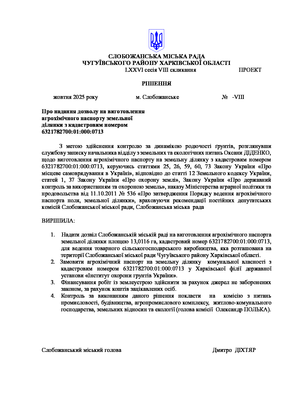 Текст проекту рішення сесії №020 Про надання дозволу на виготовлення агрохімічного паспорту земельної ділянки з кадастровим номером 6321782700:01:000:0713.