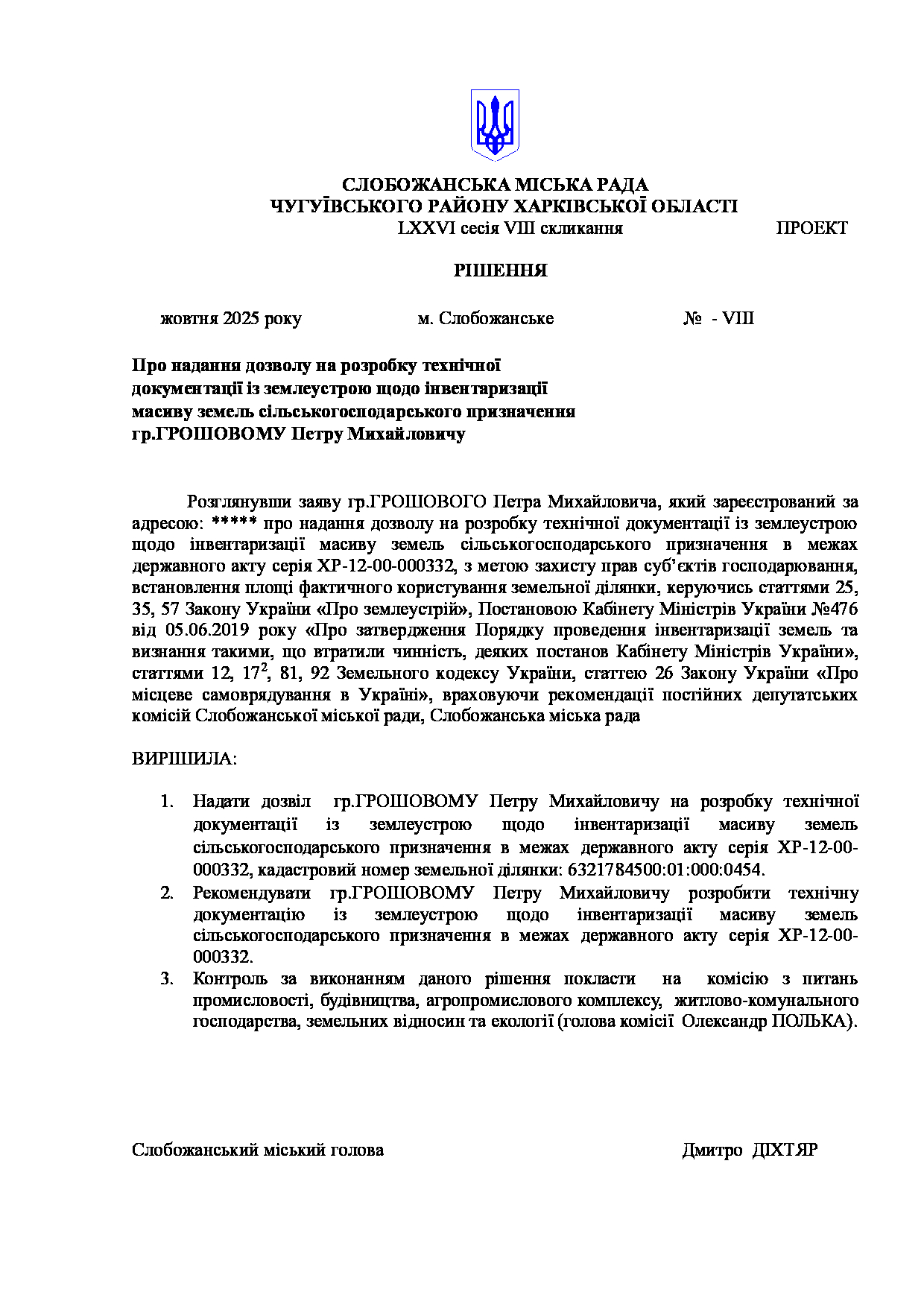 Текст проекту рішення сесії №022 Про надання дозволу на розробку технічної документації із землеустрою щодо інвентаризації масиву земель сільськогосподарського призначення гр.ГРОШОВОМУ Петру Михайловичу.