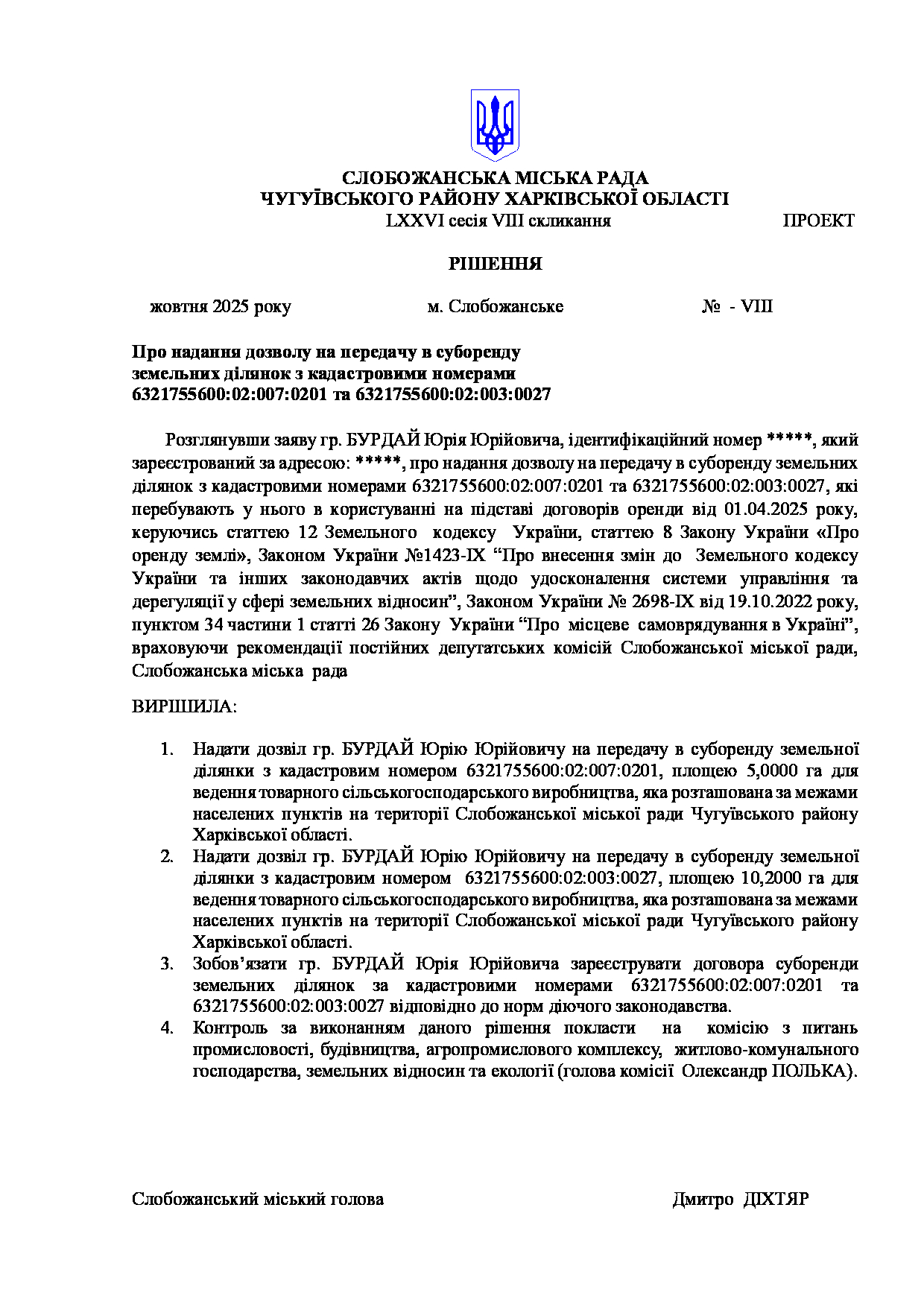 Текст проекту рішення сесії №023 Про надання дозволу на передачу в суборенду земельних ділянок з кадастровими номерами 6321755600:02:007:0201 та 6321755600:02:003:0027.