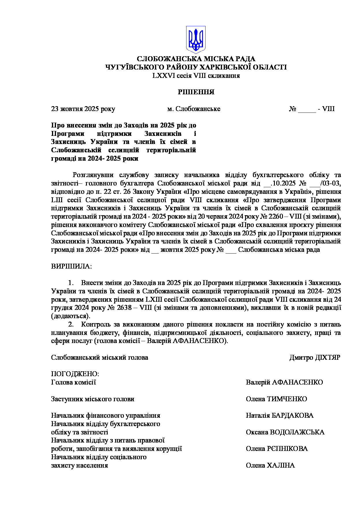 Текст проекту рішення сесії №024 Про внесення змін до Заходів на 2025 рік до Програми підтримки Захисників і Захисниць України та членів їх сімей в Слобожанській селищній територіальній громаді на 2024- 2025 роки.