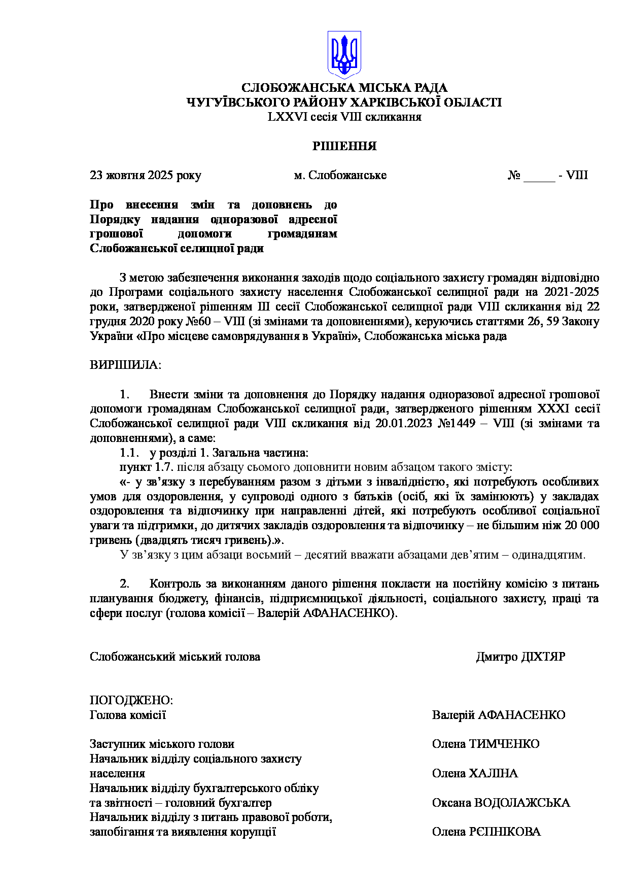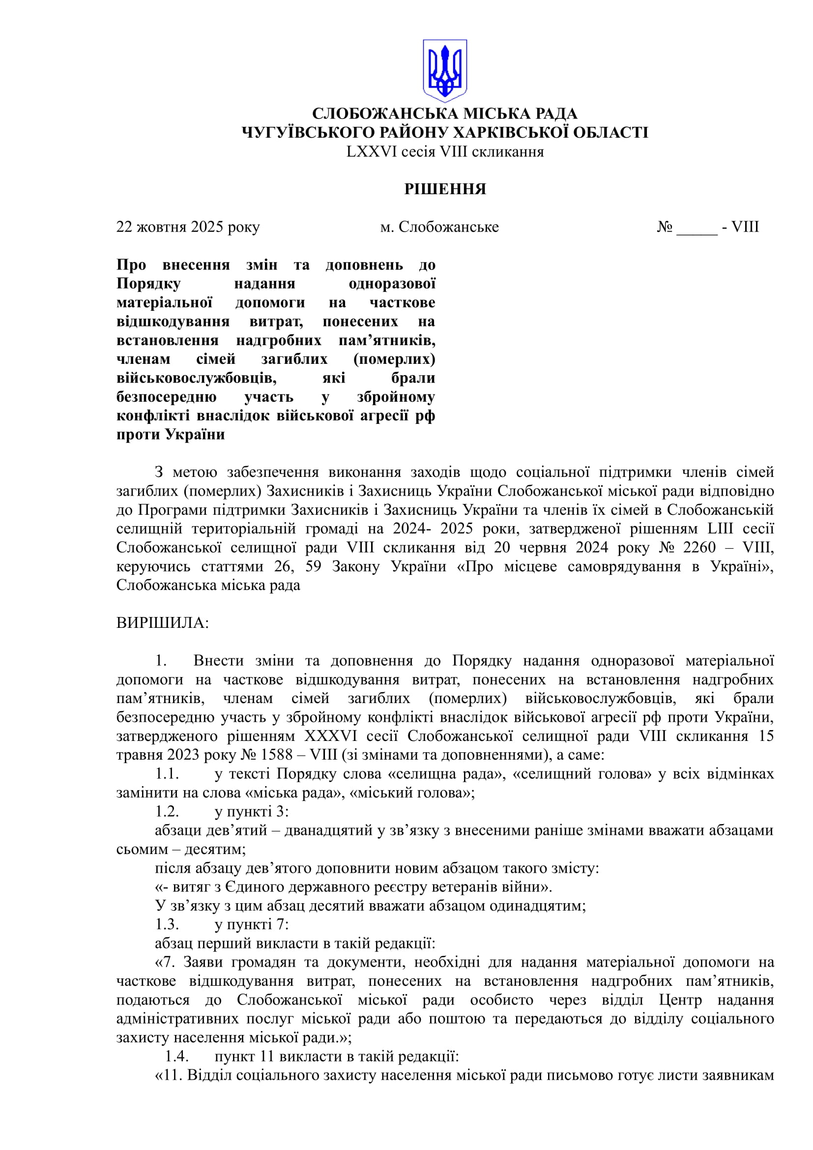 Текст проекту рішення сесії №025 Про внесення змін та доповнень до Порядку надання одноразової адресної грошової допомоги громадянам Слобожанської селищної ради.