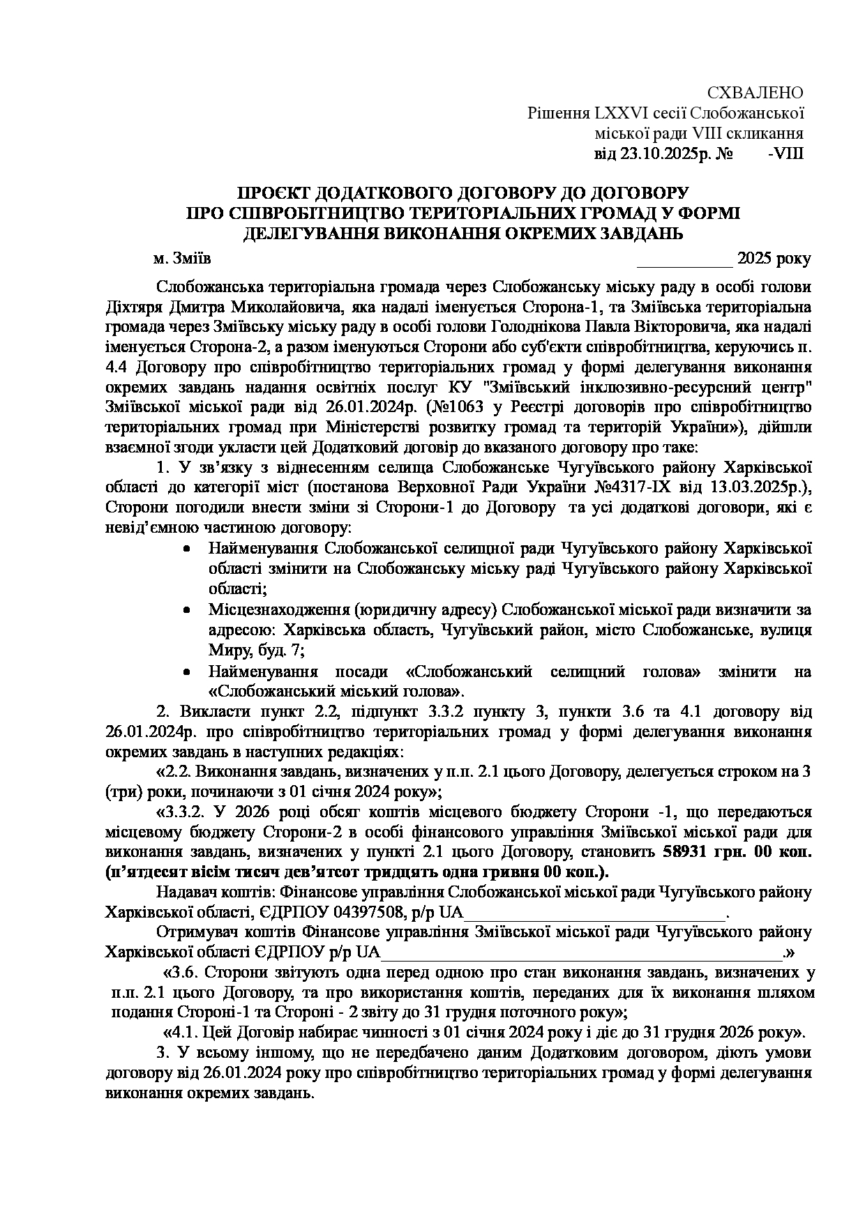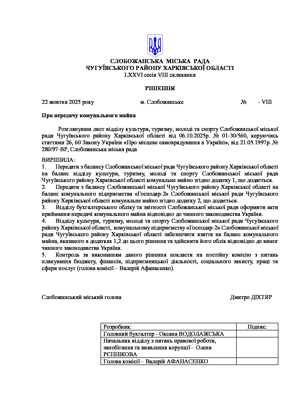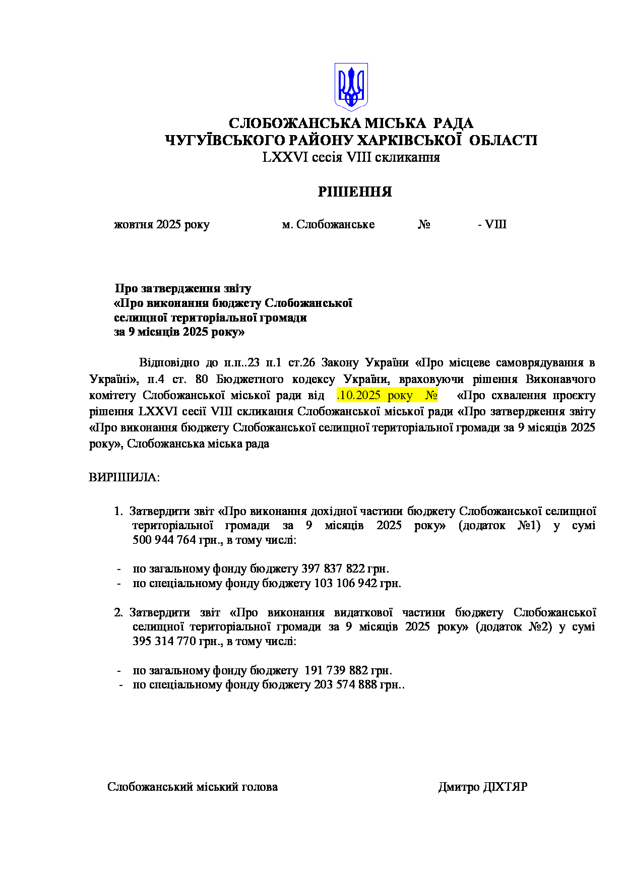 Текст проекту рішення сесії №026 Про затвердження звіту «Про виконання бюджету Слобожанської селищної територіальної громади за 9 місяців 2025 року».