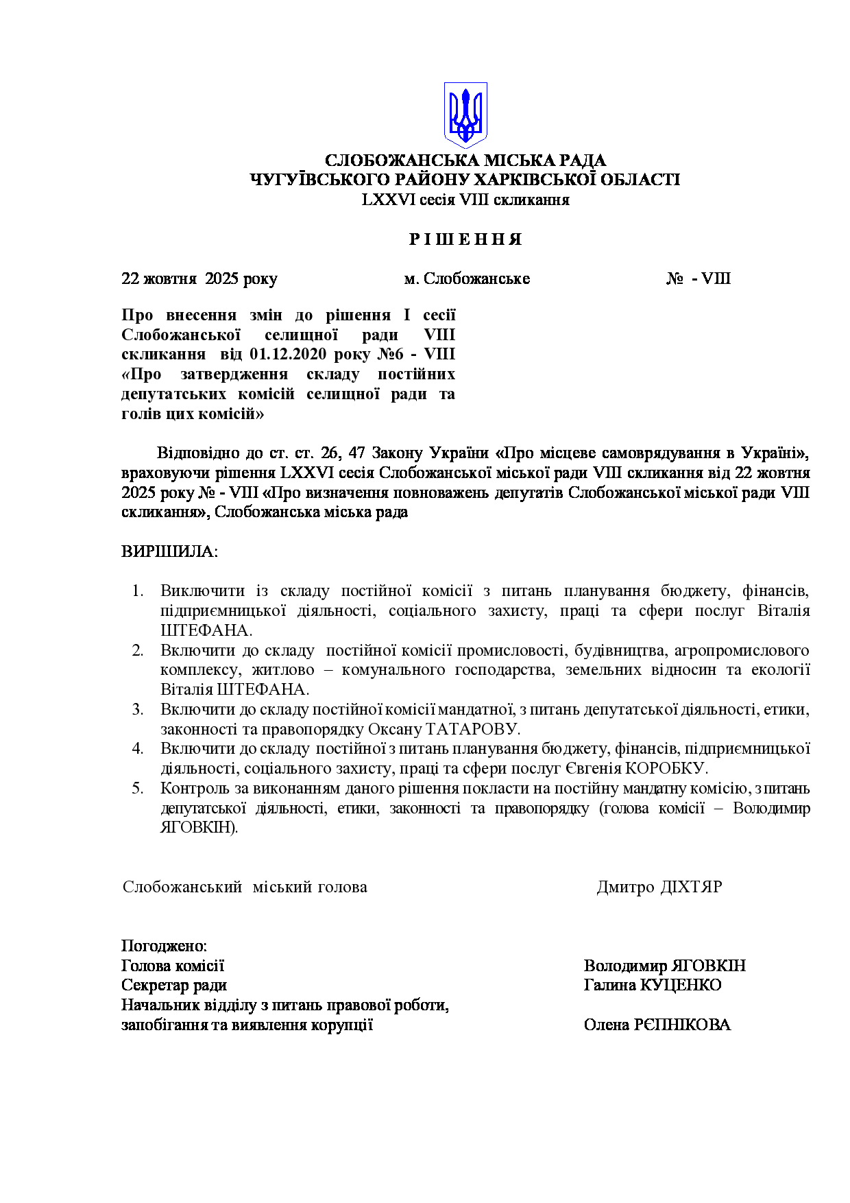 Текст проекту рішення сесії №028 Про внесення змін до рішення І сесії Слобожанської селищної ради VІІI скликання від 01.12.2020 року №6 - VІІI «Про затвердження складу постійних депутатських комісій селищної ради та голів цих комісій».