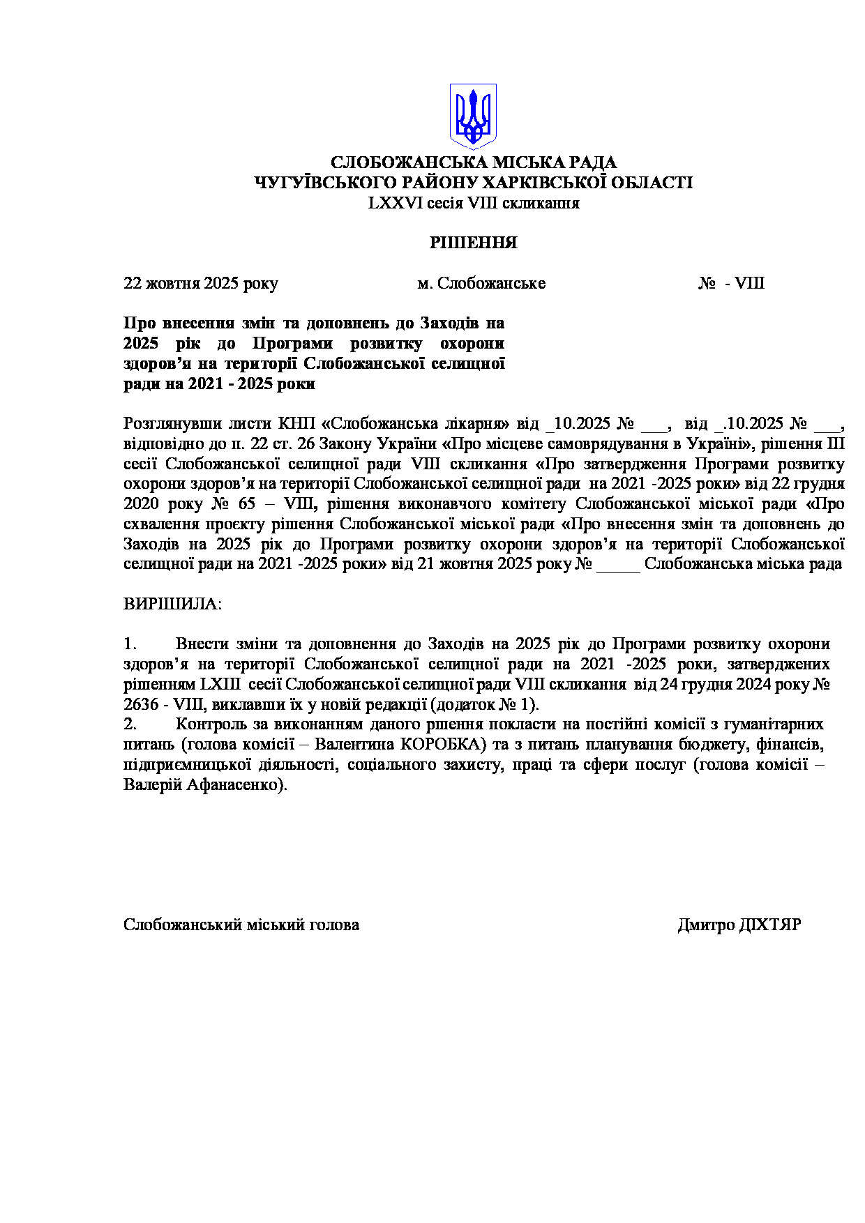 Текст проекту рішення сесії №029 Про внесення змін та доповнень до Заходів на 2025 рік до Програми розвитку охорони здоров’я на території Слобожанської селищної ради на 2021 - 2025 роки.