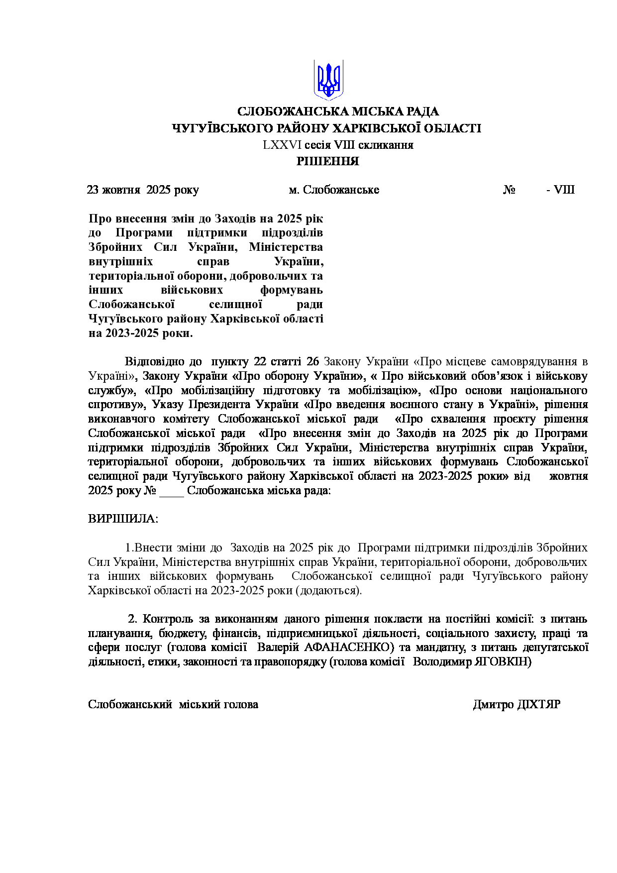 Текст проекту рішення сесії №032 Про внесення змін до Заходів на 2025 рік до Програми підтримки підрозділів Збройних Сил України, Міністерства внутрішніх справ України, територіальної оборони, добровольчих та інших військових формувань Слобожанської селищної ради Чугуївського району Харківської області на 2023-2025 роки.