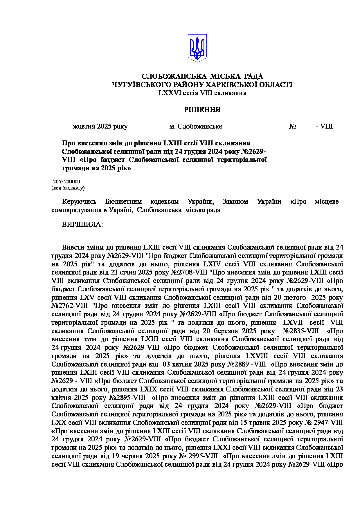 Текст проекту рішення сесії №033 Про внесення змін до рішення LXIII сесії VIII скликання Слобожанської селищної ради від 24 грудня 2024 року №2629- VIII «Про бюджет Слобожанської селищної територіальної громади на 2025 рік».