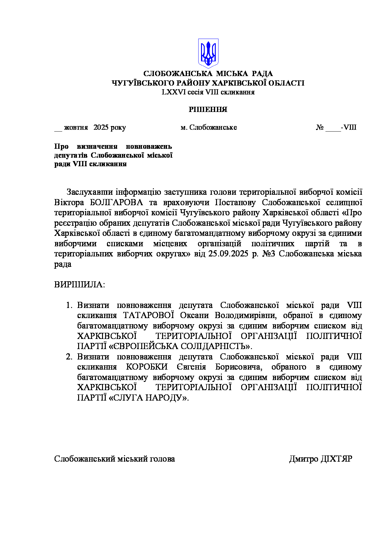 Текст проекту рішення сесії №035 Про визначення повноважень депутатів Слобожанської міської ради VІІІ скликання.