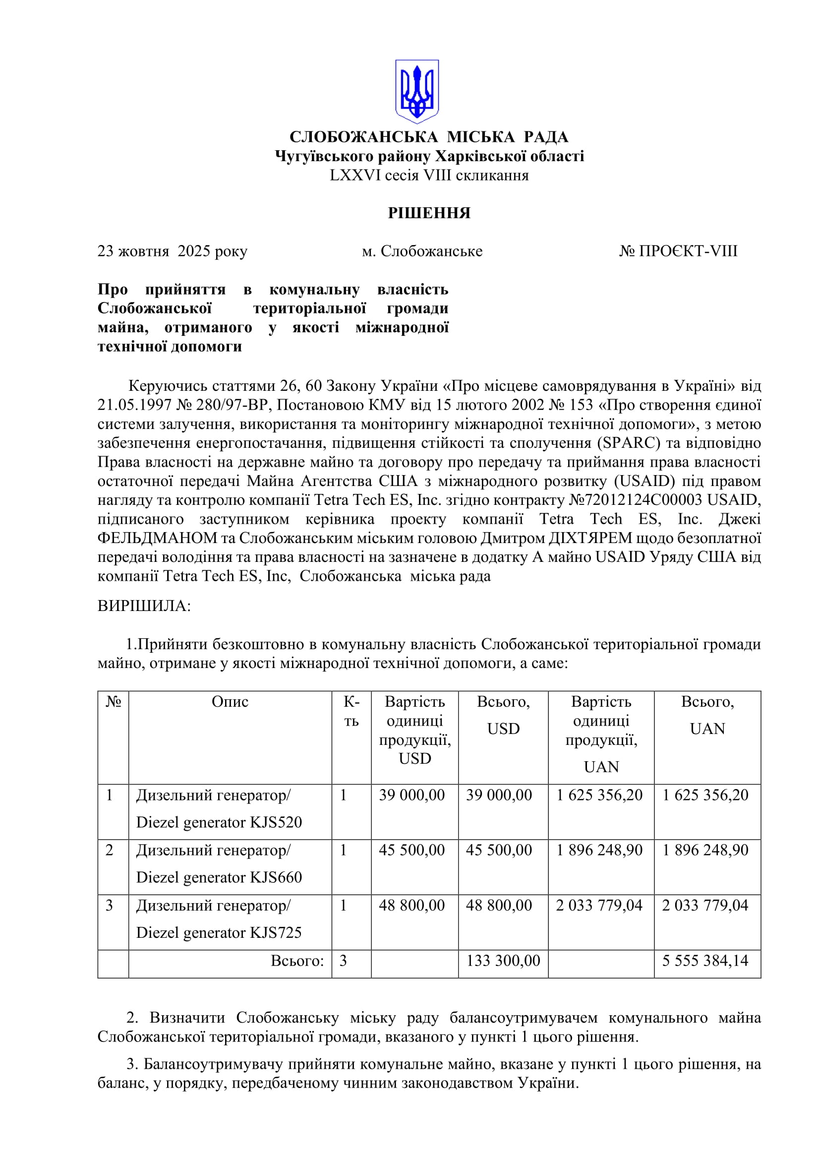 Текст проекту рішення сесії №037 Про прийняття в комунальну власність Слобожанської територіальної громади майна, отриманого у якості міжнародної технічної допомоги