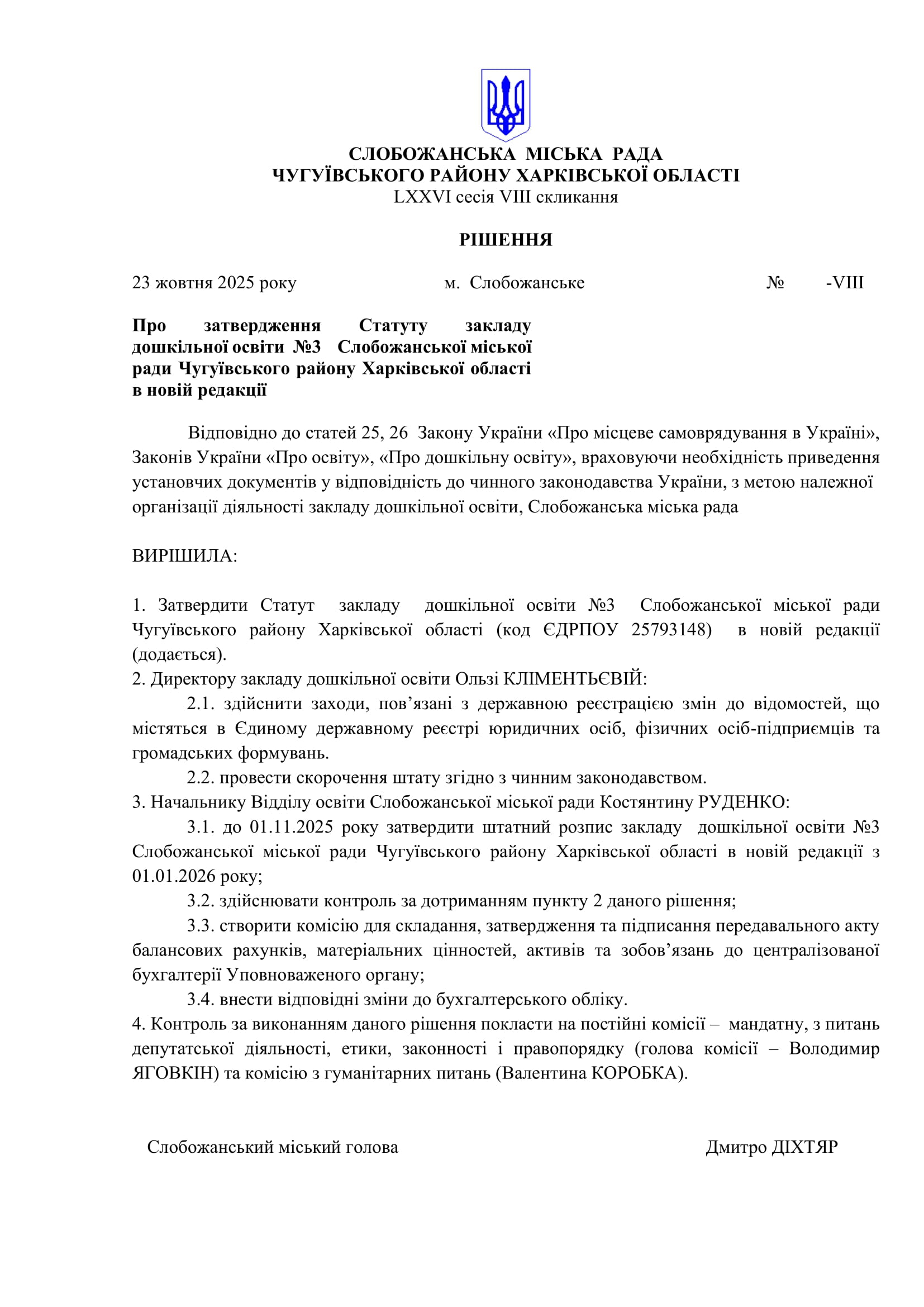 Текст проекту рішення сесії №038 Про затвердження Статуту закладу дошкільної освіти №3 Слобожанської міської ради Чугуівського району Харківської області в новій редакції