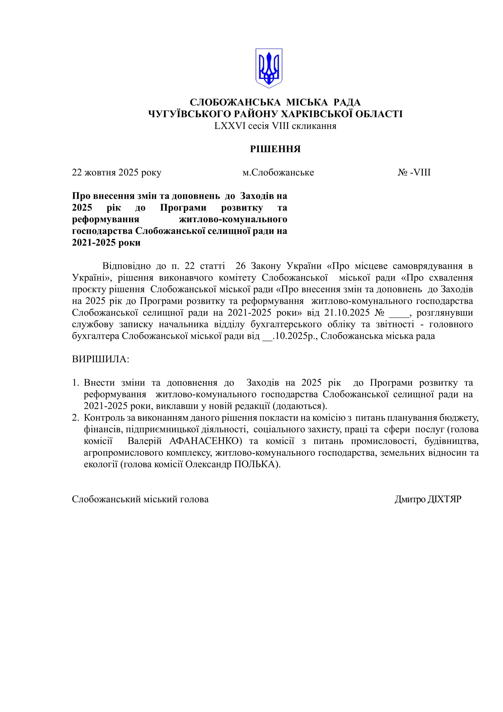 Текст проекту рішення сесії №040 Про внесення змін та доповнень до Заходів на 2025 рік до Програми розвитку та реформування житлово-комунального господарства Слобожанської селищної ради на 2021-2025 роки