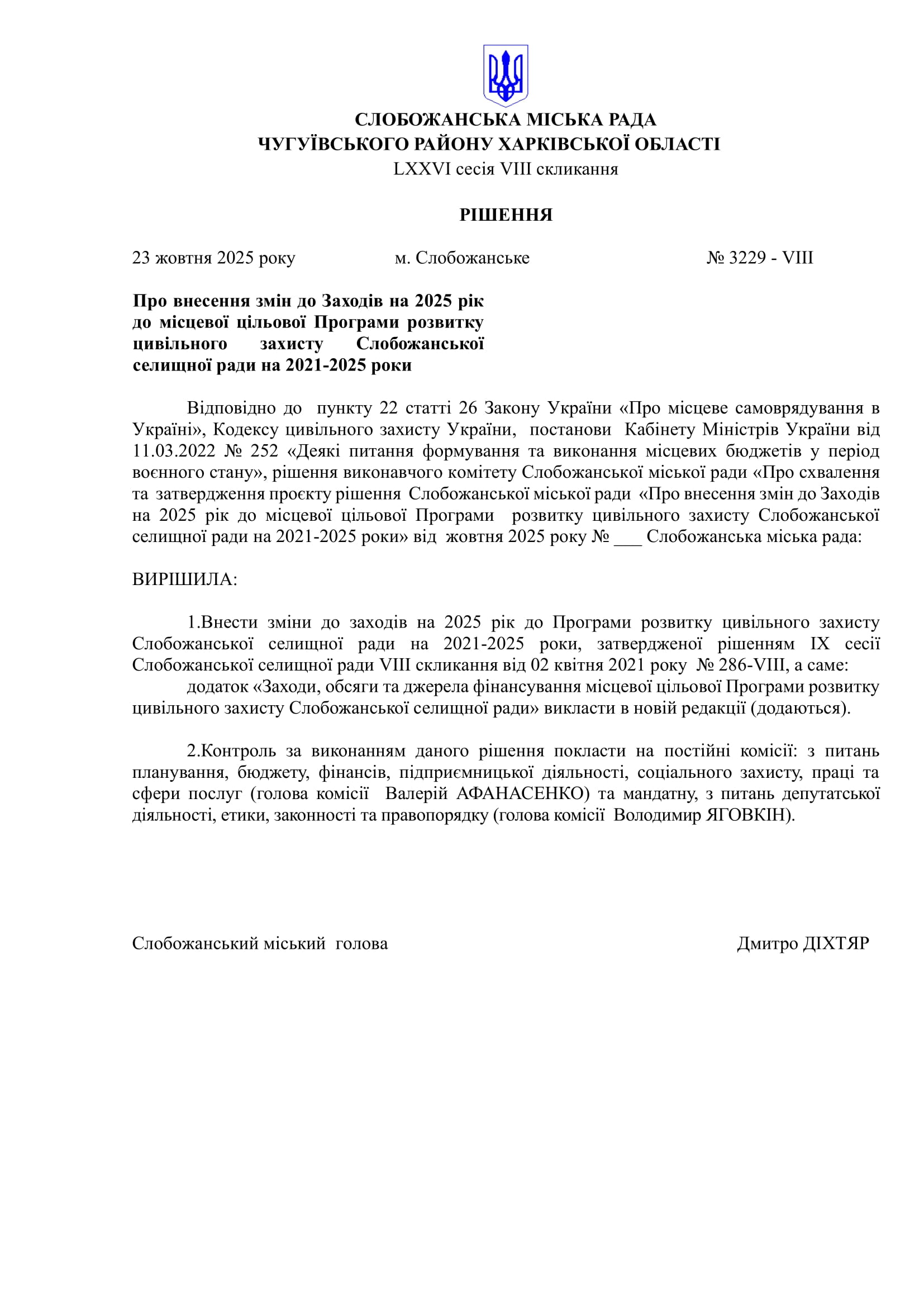 Текст проекту рішення сесії №042 Про внесення змін до Заходів на 2025 рік до місцевої цільової Програми розвитку цивільного захисту Слобожанської селищної ради на 2021-2025 роки
