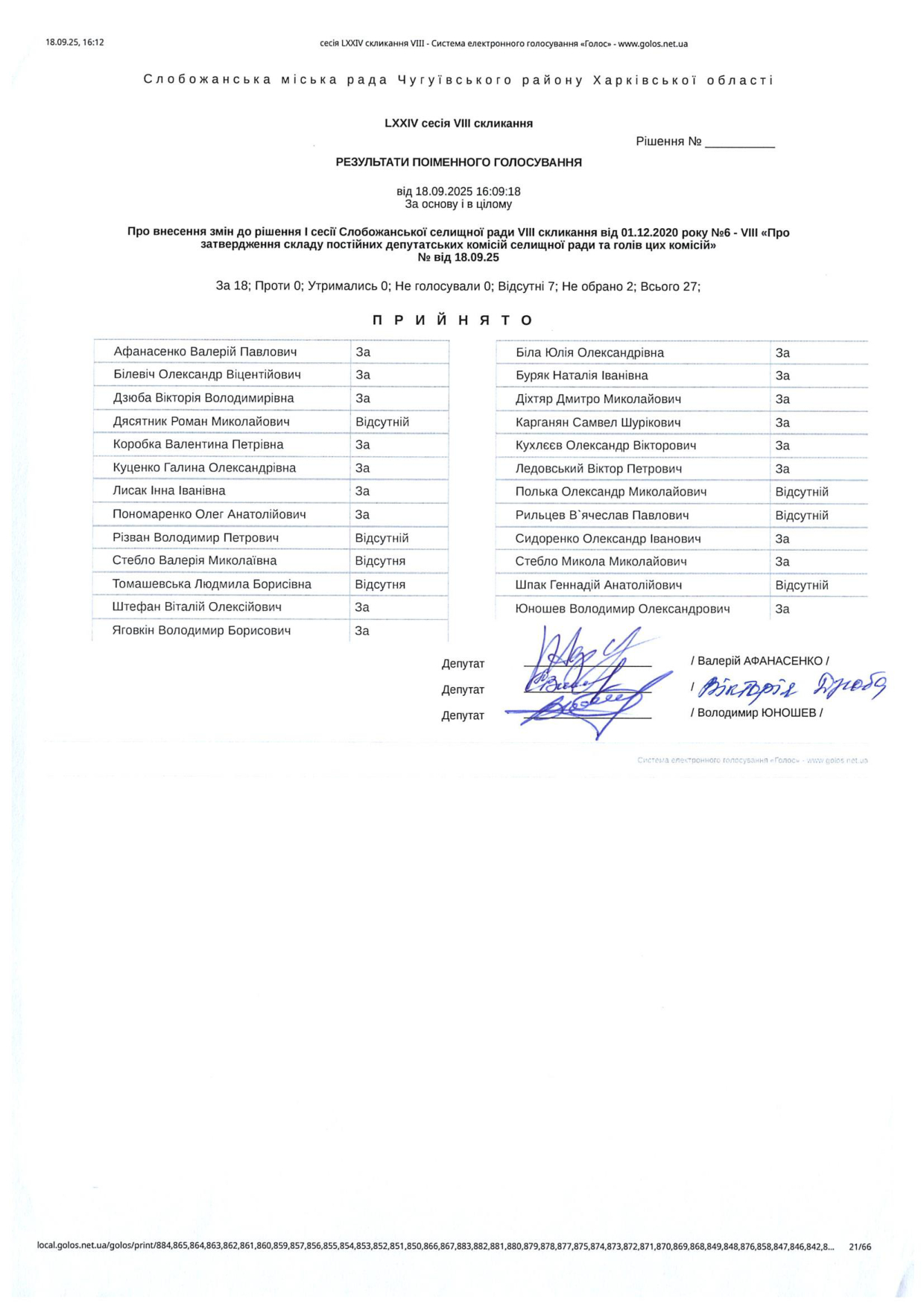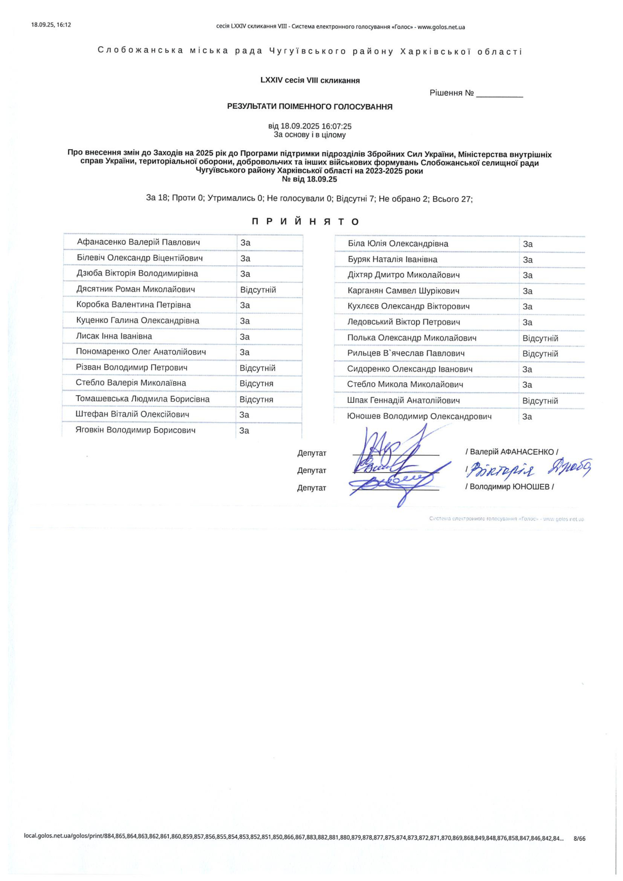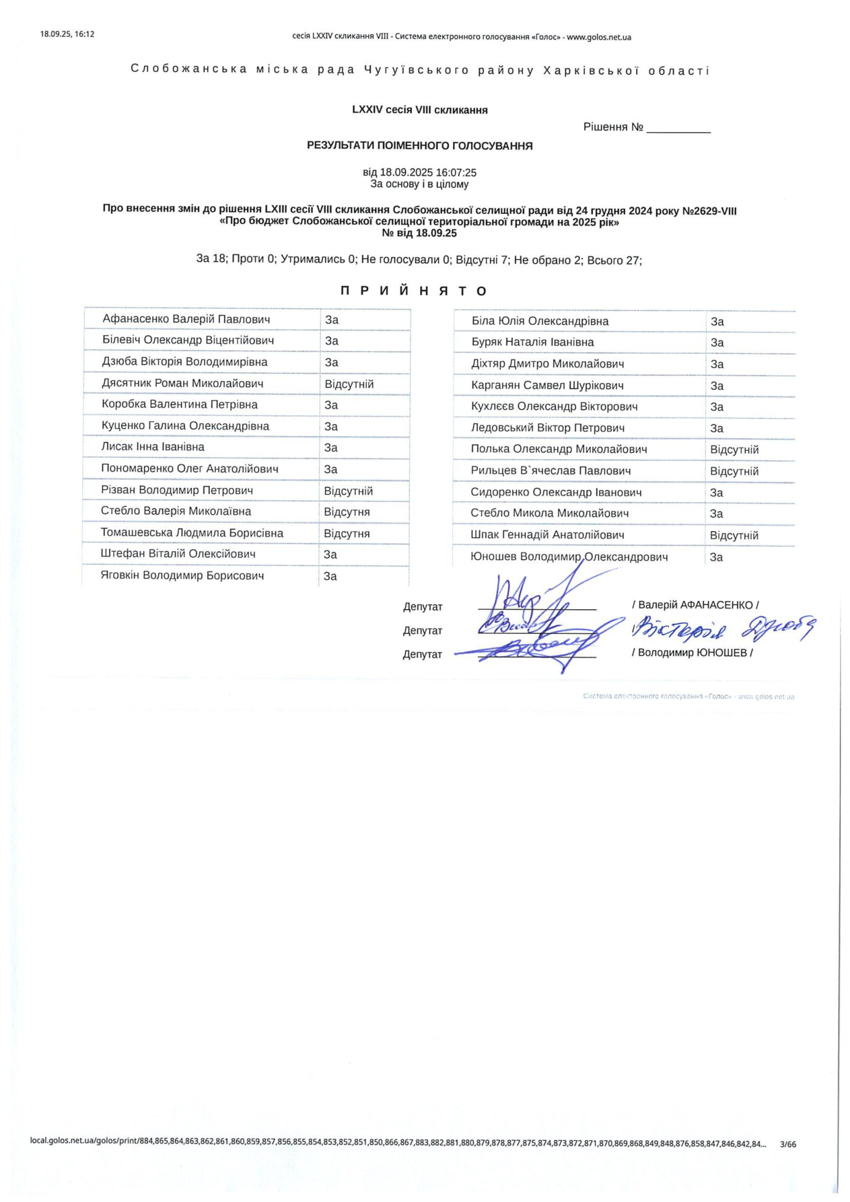 Відомості голосування до рішення сесії №3162 Про внесення змін до рішення LXIII сесії VIII скликання Слобожанської селищної ради від 24 грудня 2024 року №2629-VIII «Про бюджет Слобожанської селищної територіальної громади на 2025 рік».