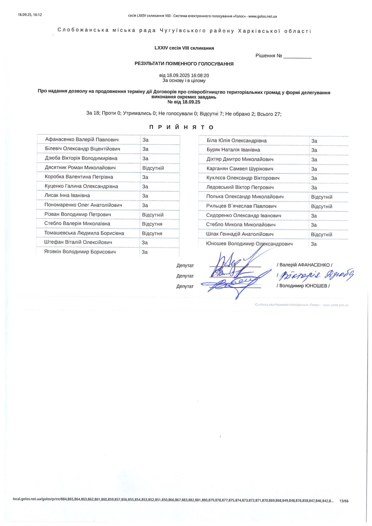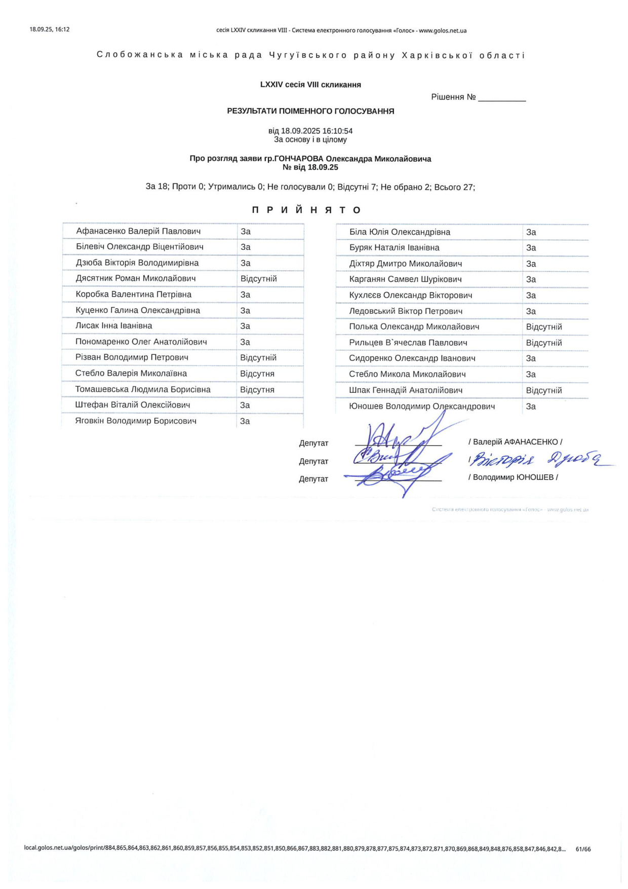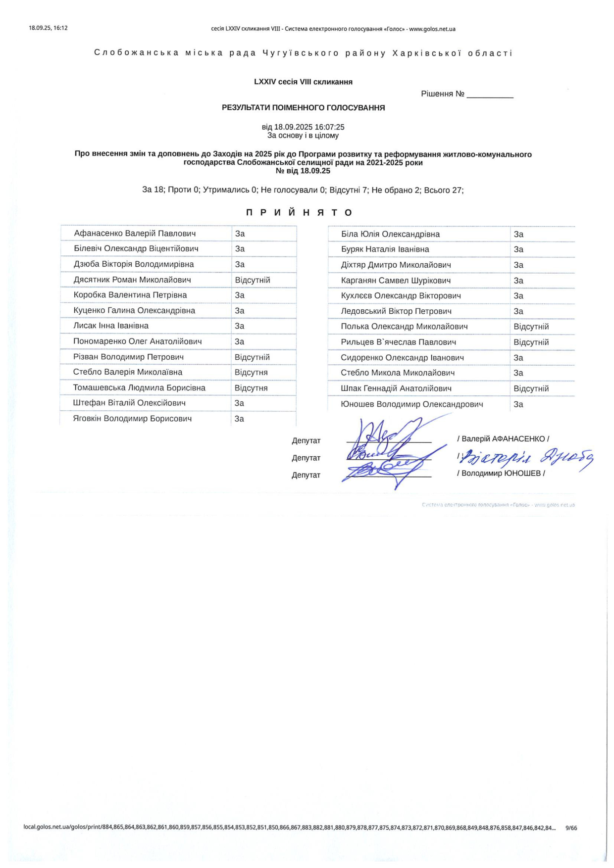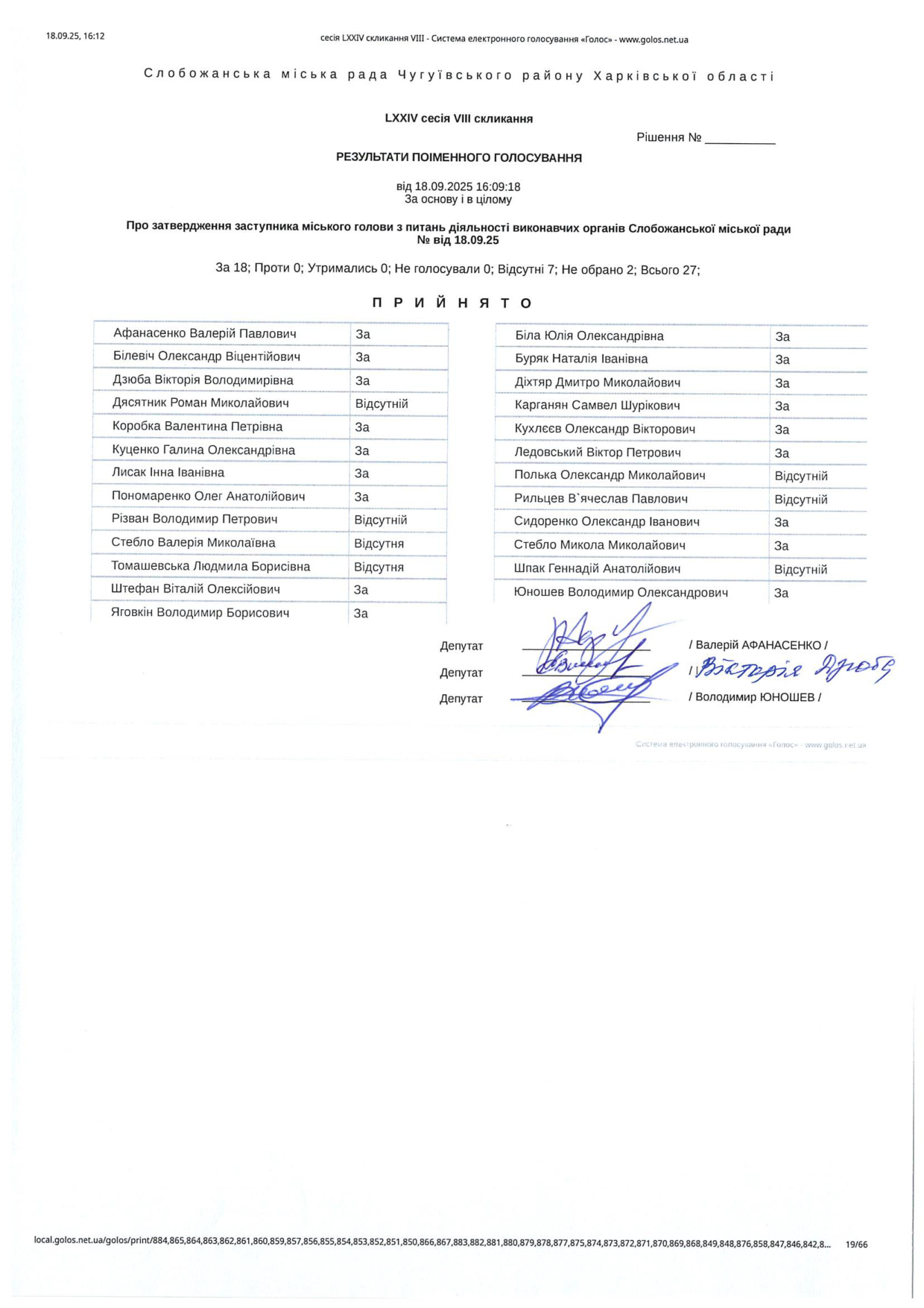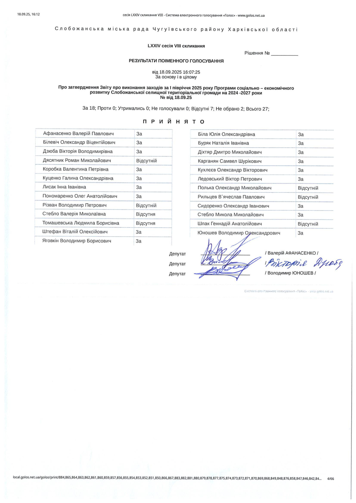 Відомості голосування до рішення сесії №3163 Про затвердження Звіту про виконання заходів за I півріччя 2025 року Програми соціально – економічного розвитку Слобожанської селищної територіальної громади на 2024 -2027 роки.