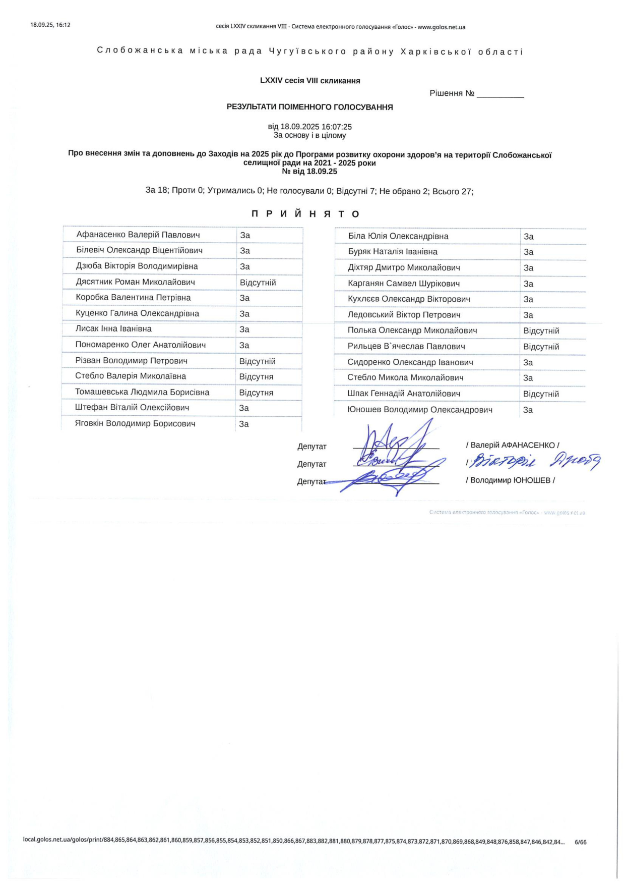 Відомості голосування до рішення сесії №3165 Про внесення змін та доповнень до Заходів на 2025 рік до Програми розвитку охорони здоров’я на території Слобожанської селищної ради на 2021 - 2025 роки.