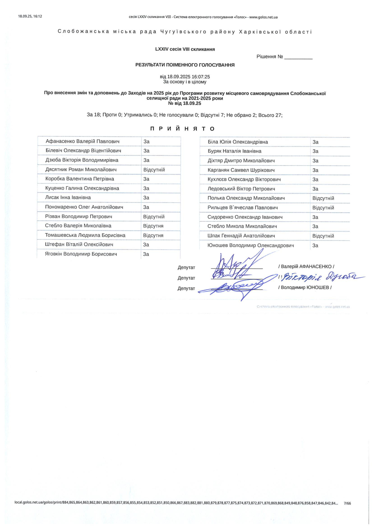 Відомості голосування до рішення сесії №3164 Про внесення змін в Заходи на 2025 рік до Програми соціально – економічного розвитку Слобожанської селищної територіальної громади на 2024 – 2027 роки.