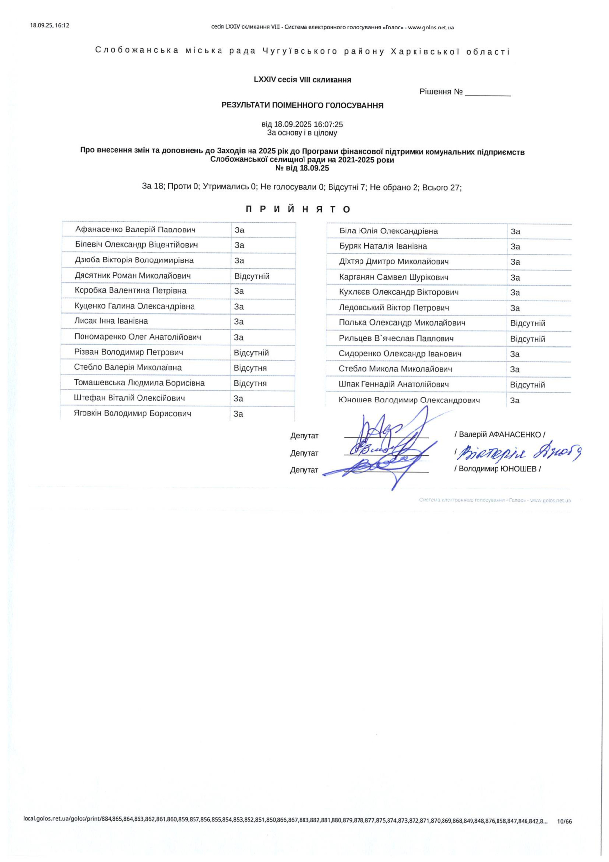 Відомості голосування до рішення сесії №3169 Про внесення змін та доповнень до Заходів на 2025 рік до Програми фінансової підтримки комунальних підприємств Слобожанської селищної ради на 2021-2025 роки.