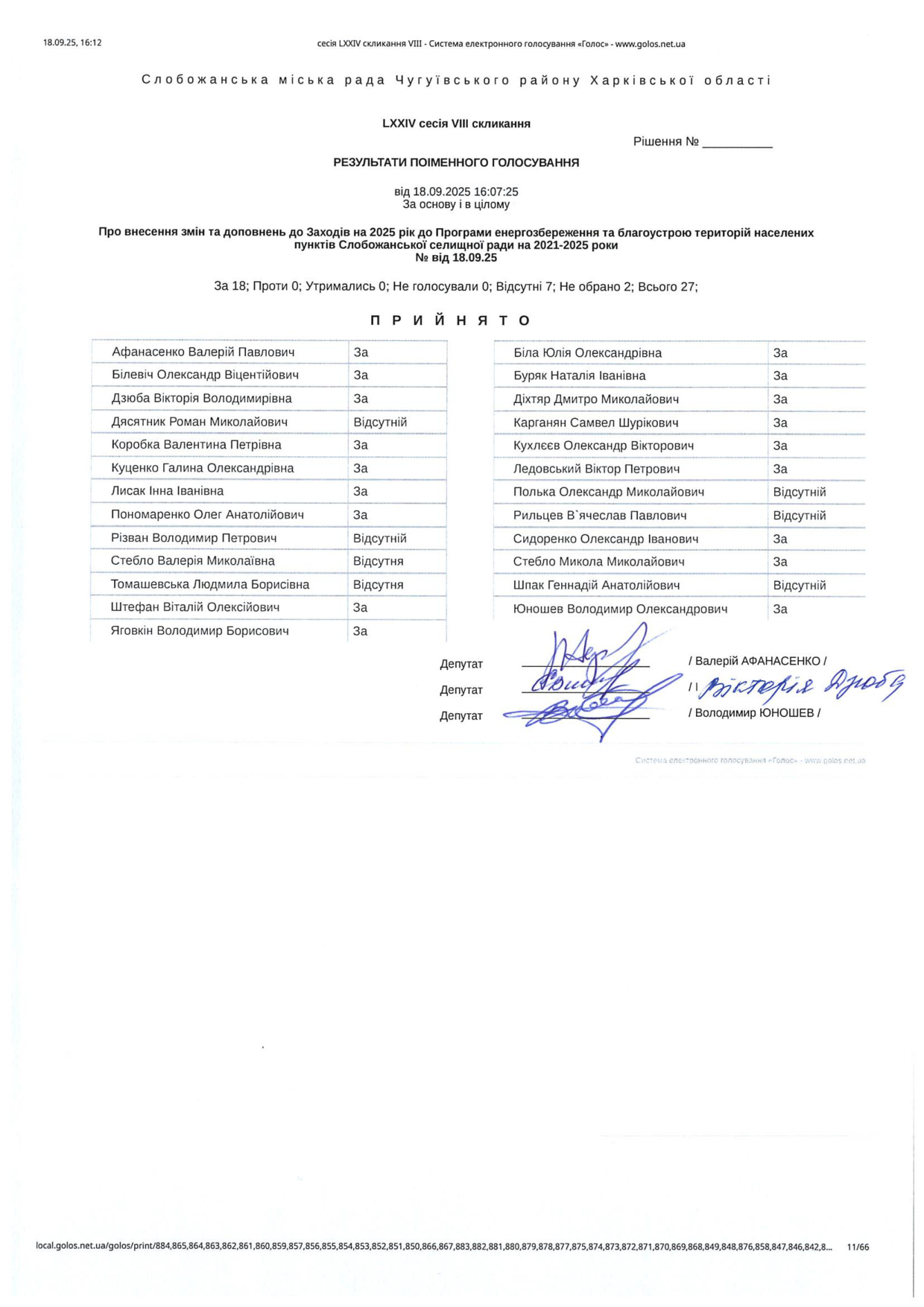 Відомості голосування до рішення сесії №3170 Про внесення змін та доповнень до Заходів на 2025 рік до Програми енергозбереження та благоустрою територій населених пунктів Слобожанської селищної ради на 2021-2025 роки.