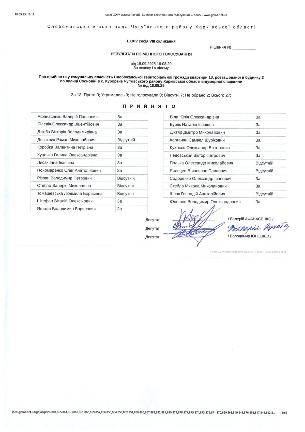 Відомості голосування до рішення сесії №3174 Про прийняття у комунальну власність Слобожанської територіальної громади квартири 10, розташованої в будинку 3 по вулиці Сосновій в с. Курортне Чугуївського району Харківської області відумерлої спадщини.