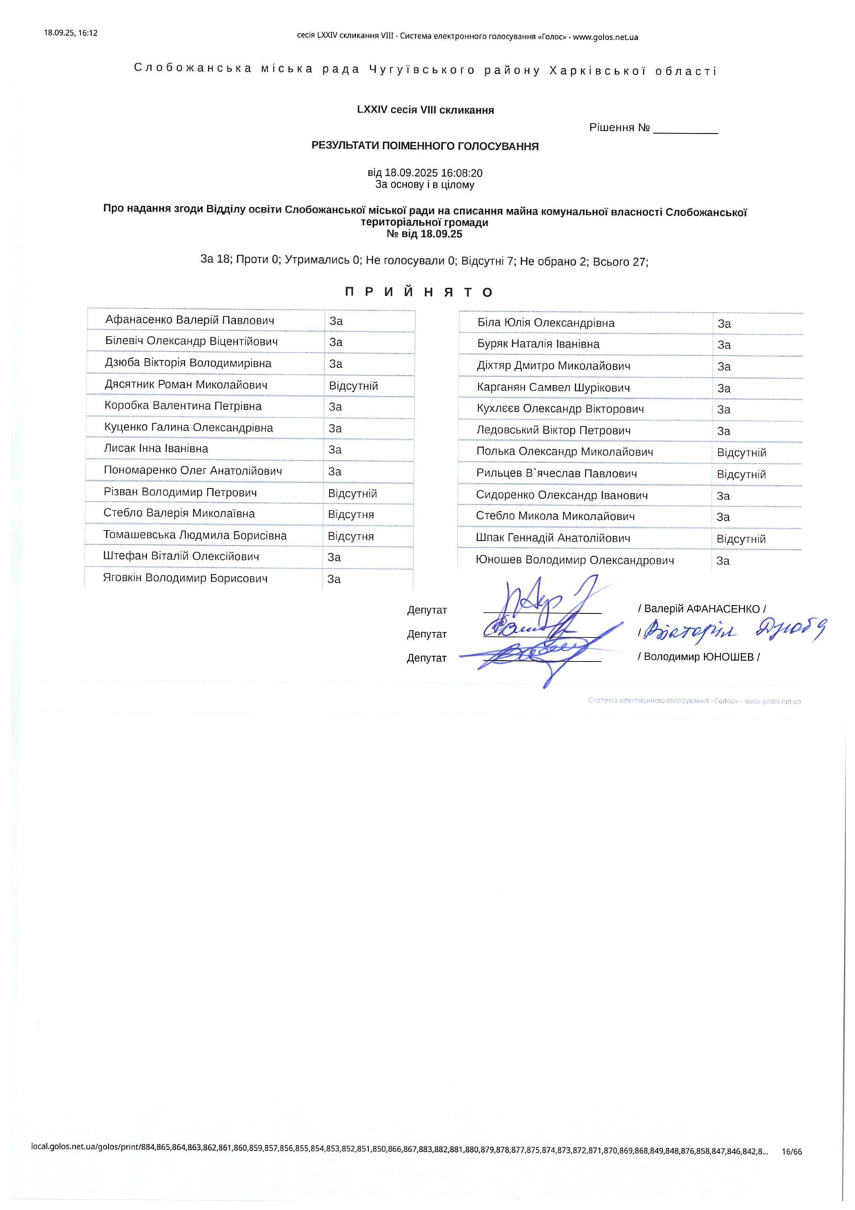 Відомості голосування до рішення сесії №3175 Про надання згоди Відділу освіти Слобожанської міської ради на списання майна комунальної власності Слобожанської територіальної громади.