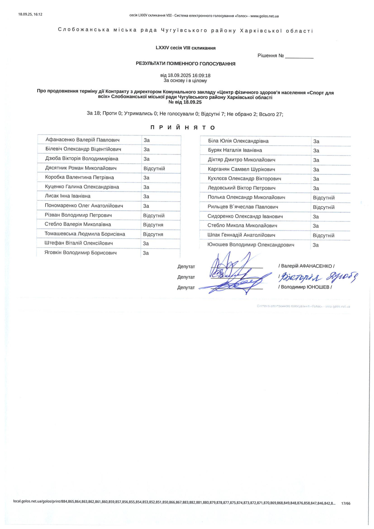Відомості голосування до рішення сесії №3176 Про продовження терміну дії Контракту з директором Комунального закладу «Центр фізичного здоров’я населення «Спорт для всіх» Слобожанської міської ради Чугуївського району Харківської області.