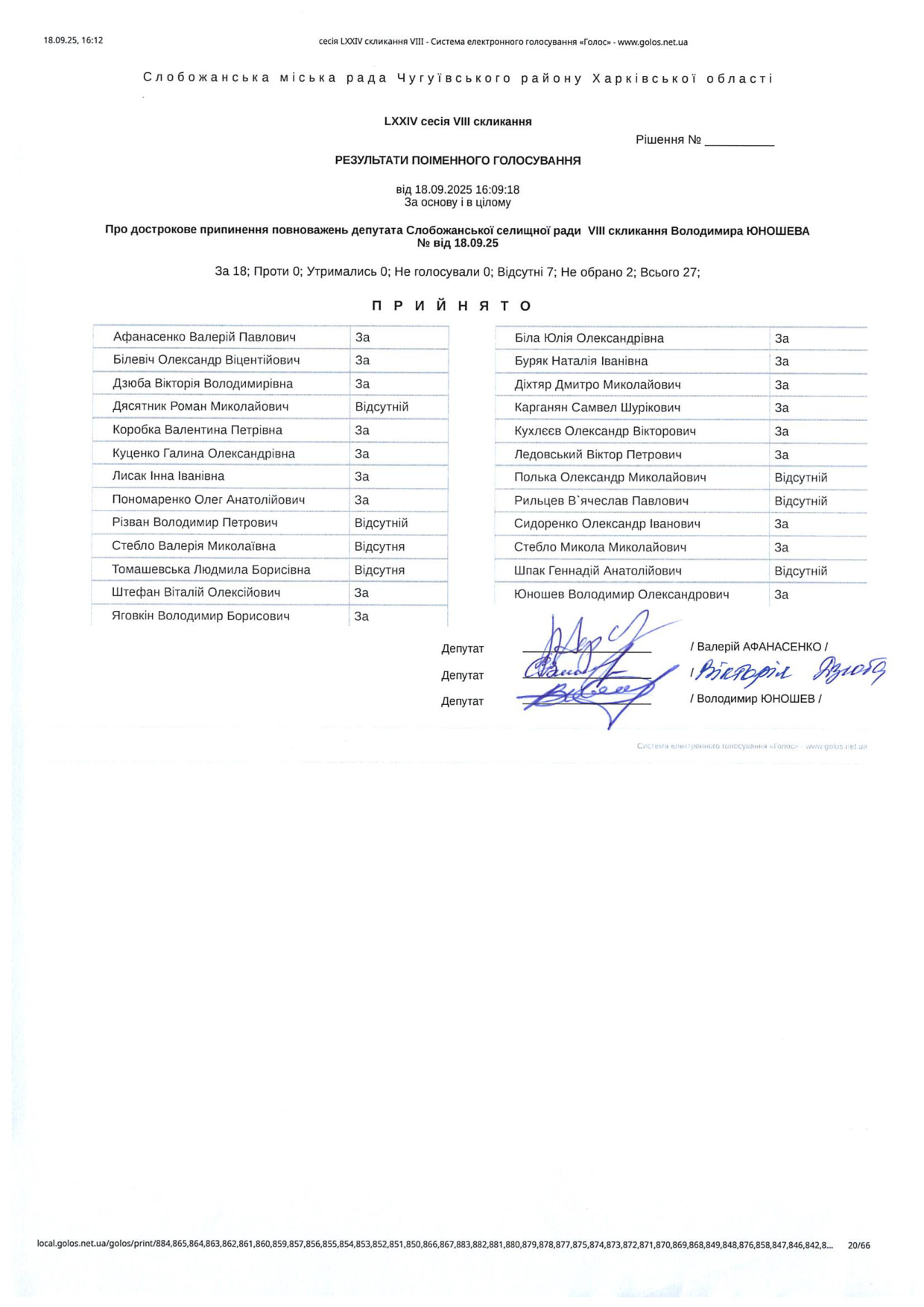 Відомості голосування до рішення сесії №3179 Про дострокове припинення повноважень депутата Слобожанської селищної ради VІІІ скликання Володимира ЮНОШЕВА.