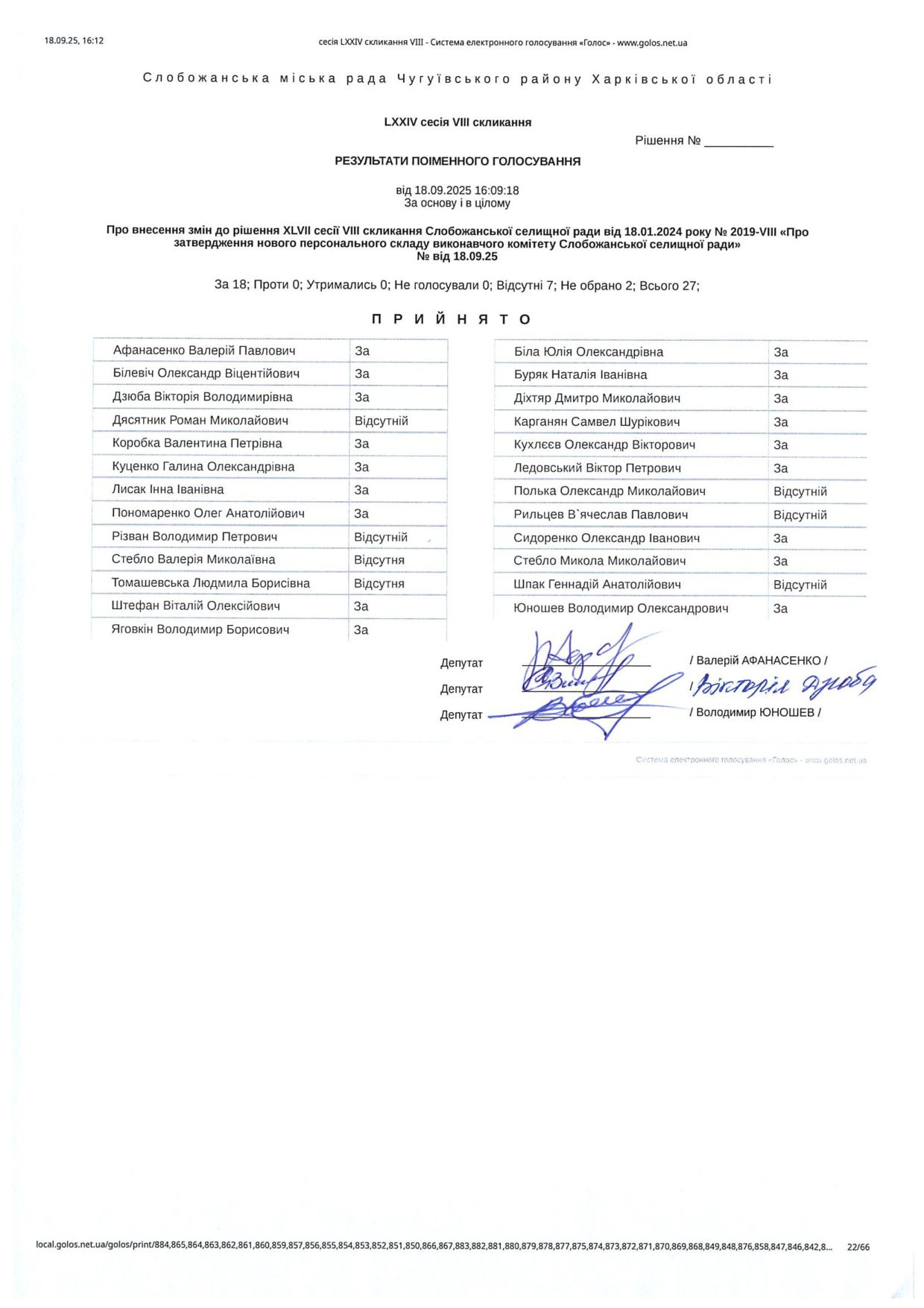 Відомості голосування до рішення сесії №3181 Про внесення змін до рішення XLVII сесії VІІІ скликання Слобожанської селищної ради від 18.01.2024 року № 2019-VІІІ «Про затвердження нового персонального складу виконавчого комітету Слобожанської селищної ради».