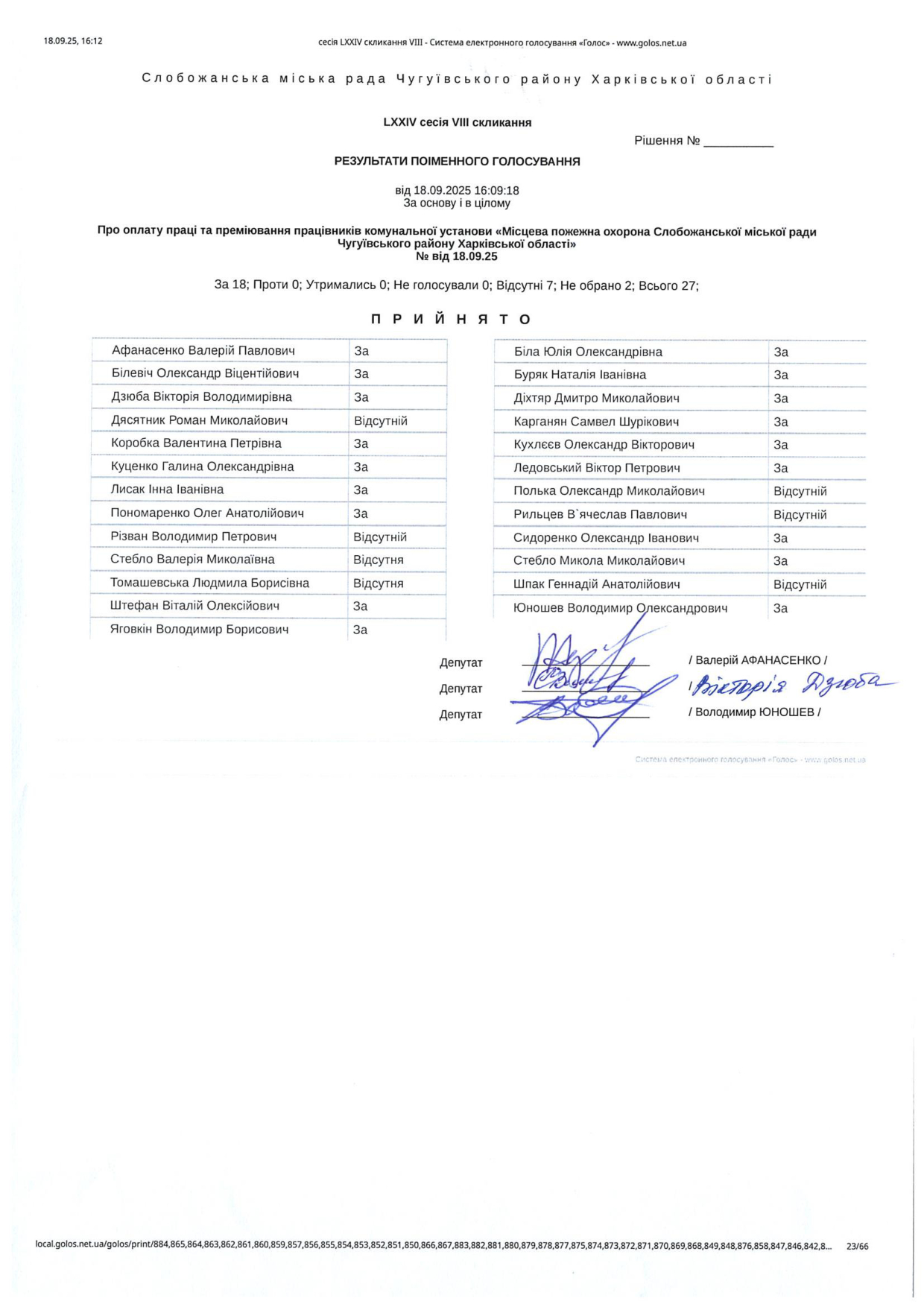 Відомості голосування до рішення сесії №3182 Про оплату праці та преміювання працівників комунальної установи «Місцева пожежна охорона Слобожанської міської ради Чугуївського району Харківської області».