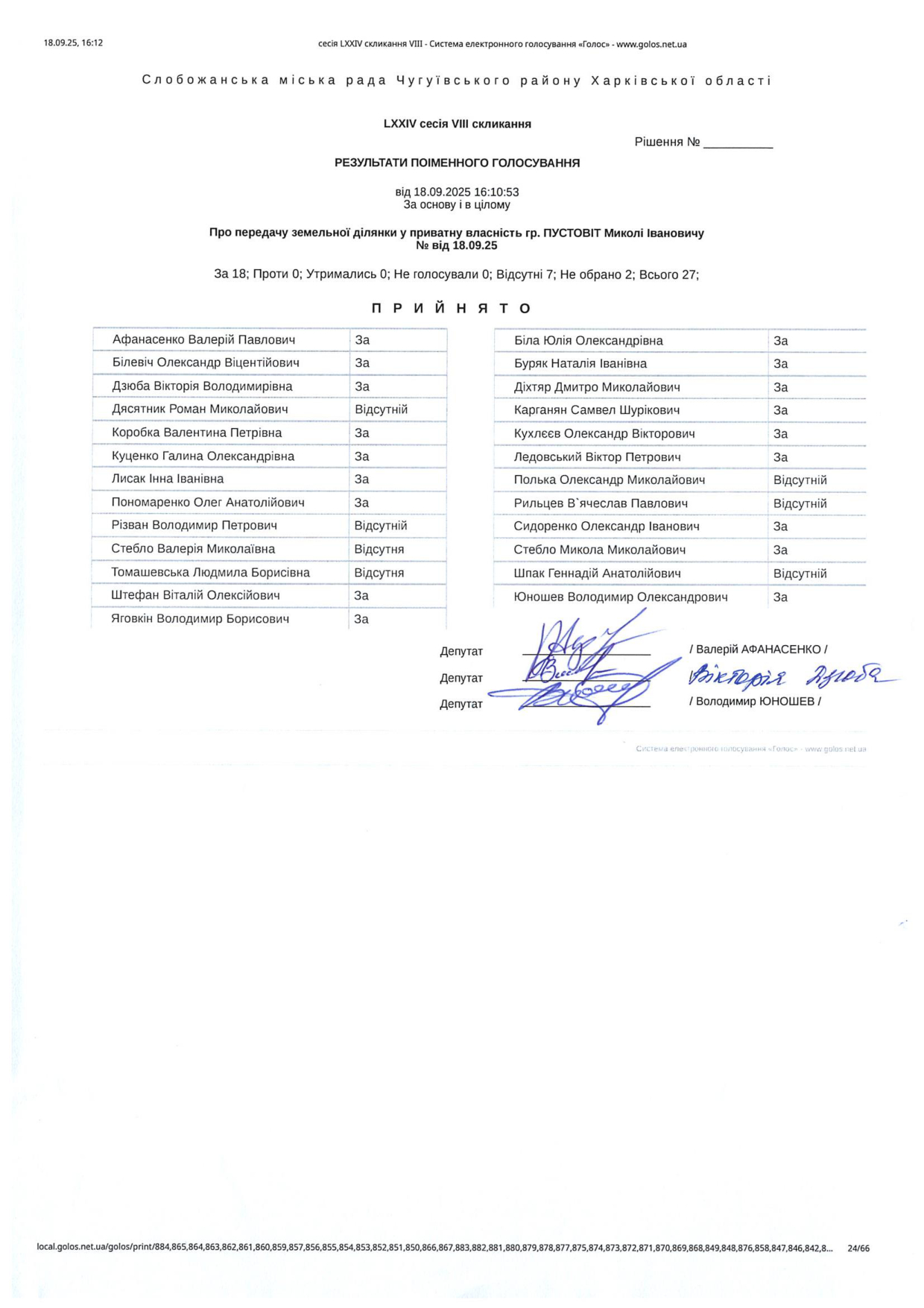 Відомості голосування до рішення сесії №3183 Про передачу земельної ділянки у приватну власність гр. ПУСТОВІТ Миколі Івановичу.