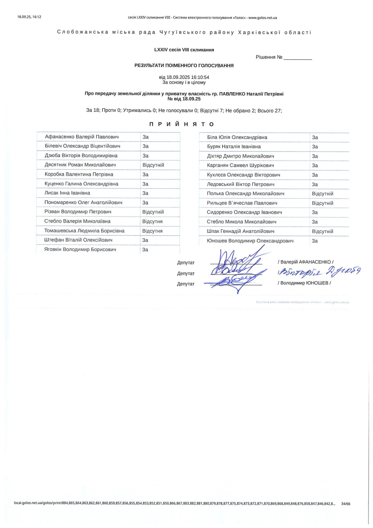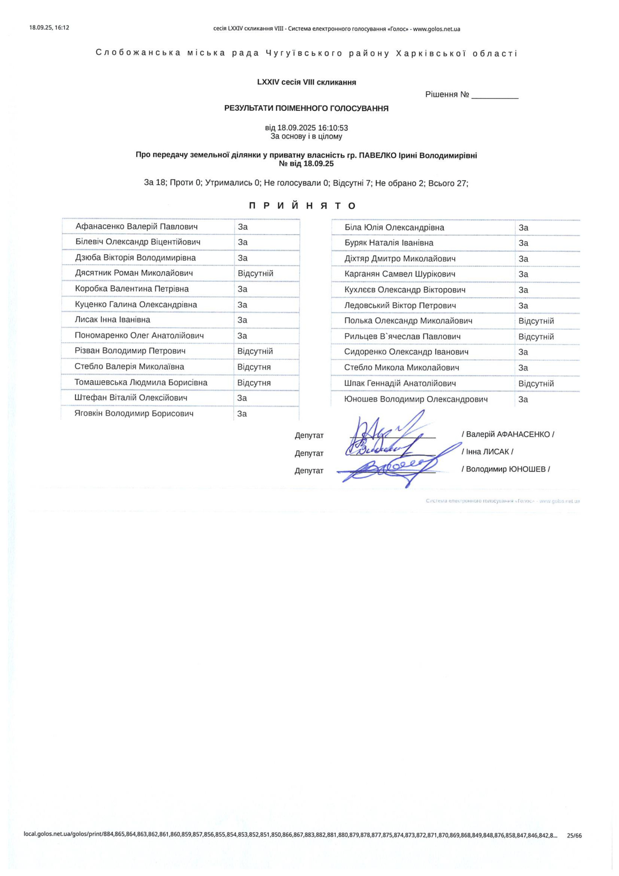 Відомості голосування до рішення сесії №3184 Про передачу земельної ділянки у приватну власність гр. ПАВЕЛКО Ірині Володимирівні.