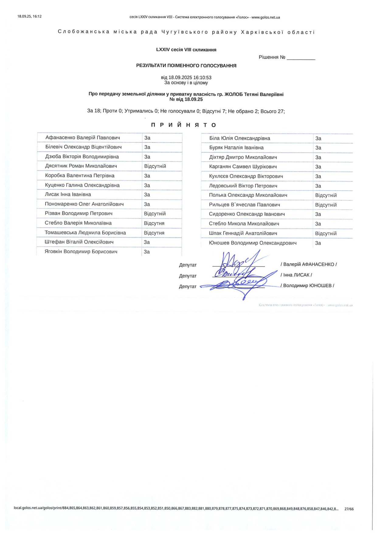 Відомості голосування до рішення сесії №3186 Про передачу земельної ділянки у приватну власність гр. ЖОЛОБ Тетяні Валеріївні.