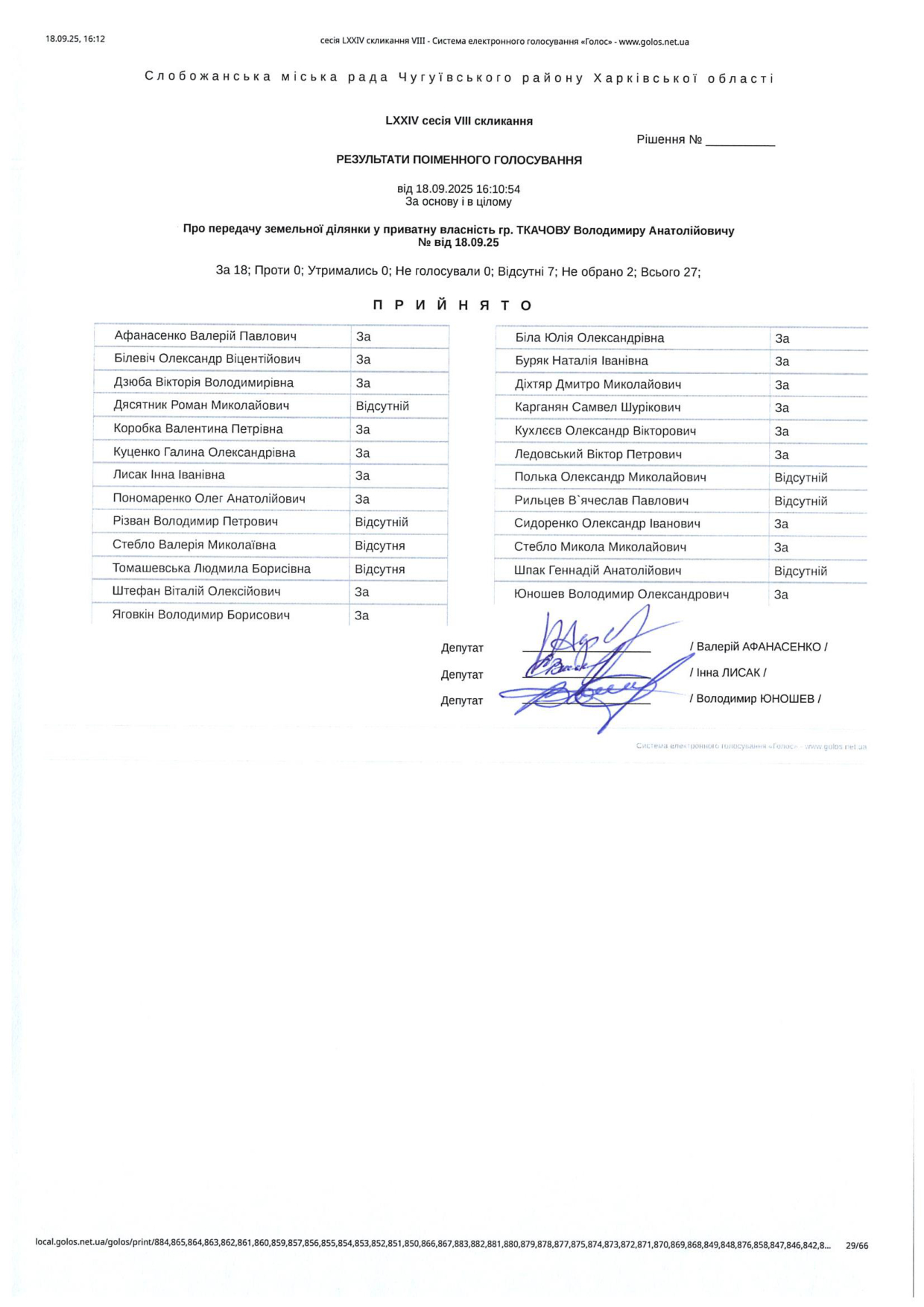 Відомості голосування до рішення сесії №3188 Про передачу земельної ділянки у приватну власність гр. ТКАЧОВУ Володимиру Анатолійовичу.