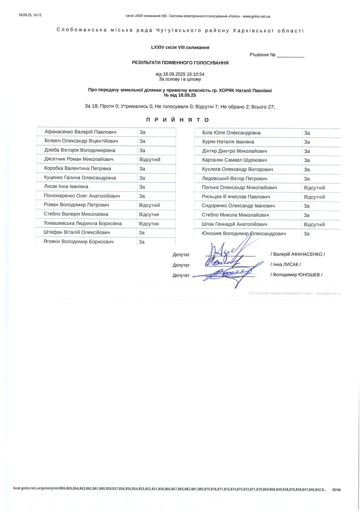 Відомості голосування до рішення сесії №3189 Про передачу земельної ділянки у приватну власність гр. КОРЯК Наталії Павлівні.
