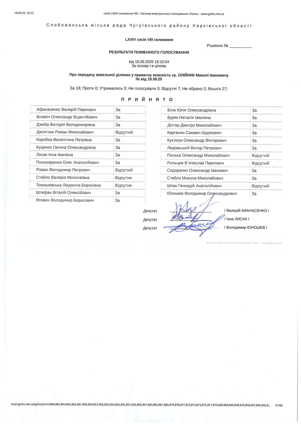 Відомості голосування до рішення сесії №3190 Про передачу земельної ділянки у приватну власність гр. ОЛІЙНИК Миколі Івановичу.