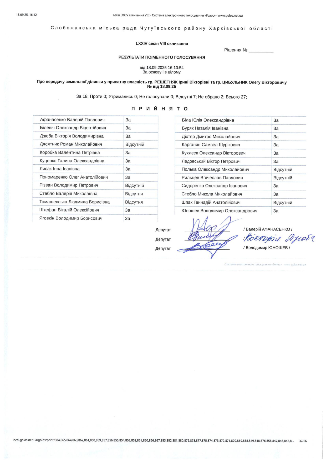 Відомості голосування до рішення сесії №3191 Про передачу земельної ділянки у приватну власність гр. РЕШЕТНЯК Ірині Вікторівні та гр. ЦИБУЛЬНИК Олегу Вікторовичу.