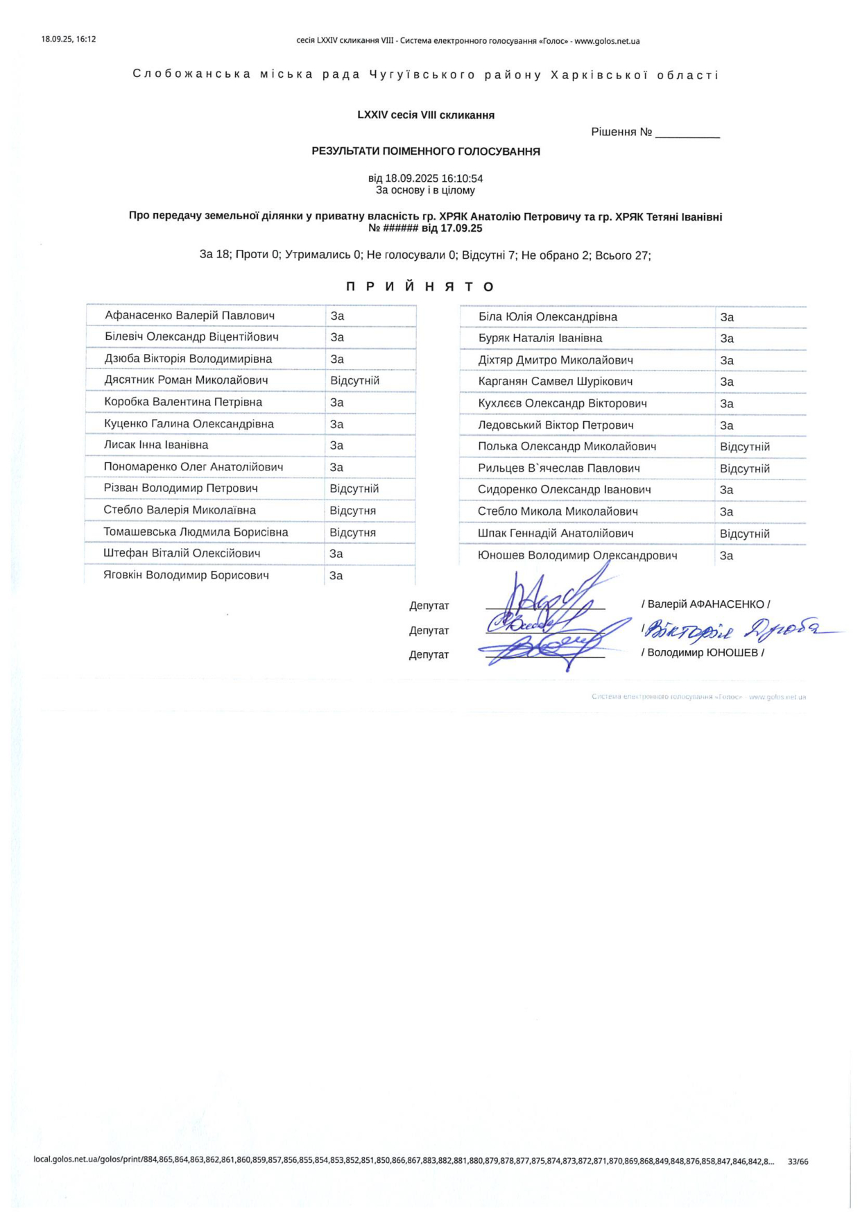 Відомості голосування до рішення сесії №3192 Про передачу земельної ділянки у приватну власність гр. ХРЯК Анатолію Петровичу та гр. ХРЯК Тетяні Іванівні.